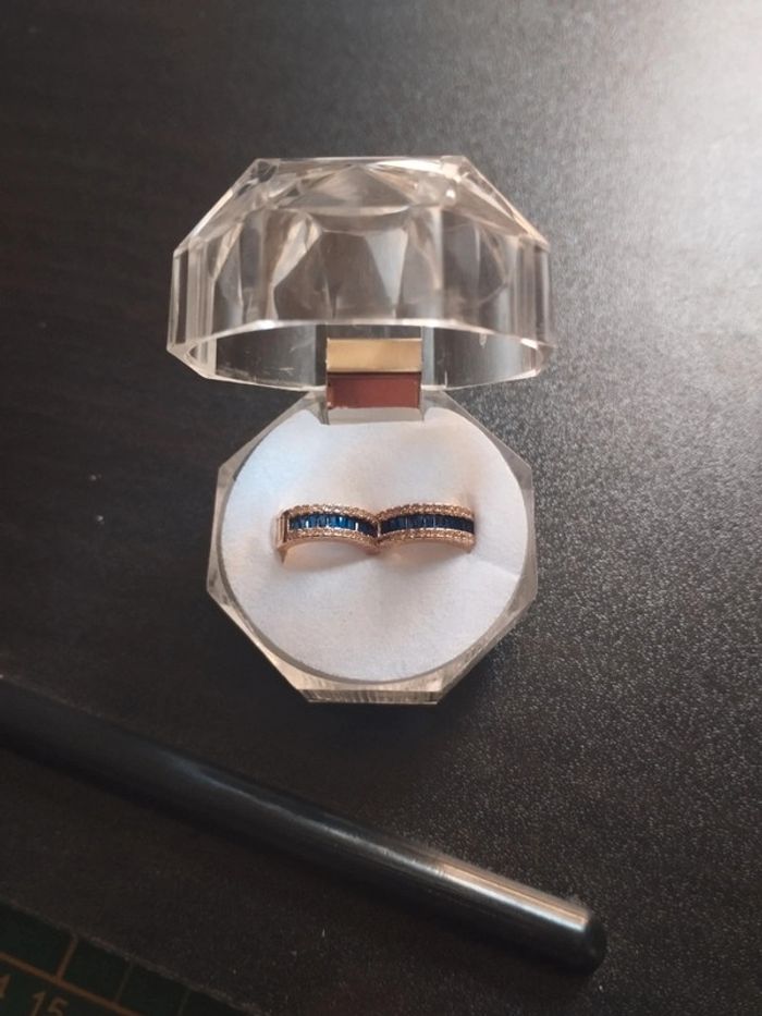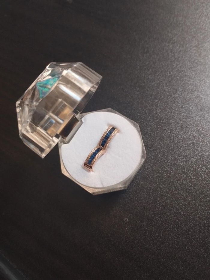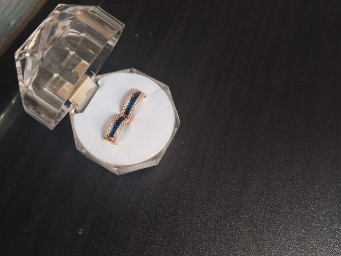 Boucles d'oreilles en plaqué or serties de zircons bleu taille baguette. Vendues neuves avec coffret