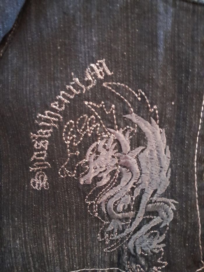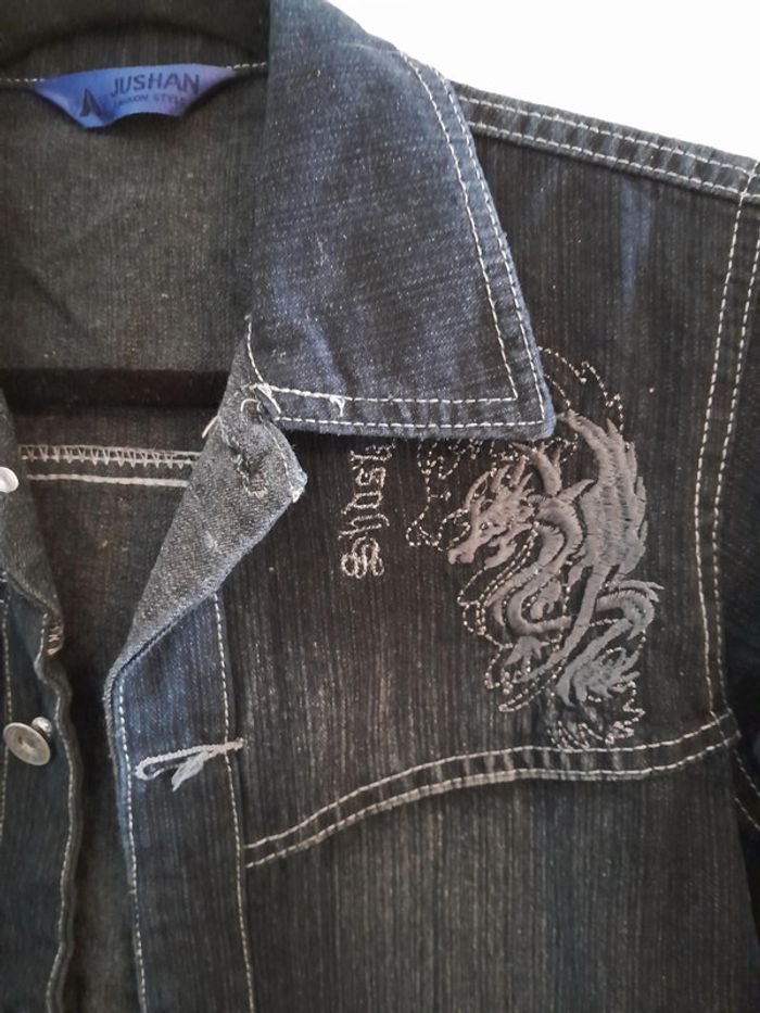 Veste en jeans, bleu foncé, taille 12ans, Marque Jushan avec dragon en petits strass MESURES DU VETEMENT POSE A PLAT : Largeur épaules : 36,5cm largeur poitrine de aisselle à aisselle : 45cm hauteur totale : 51cm hauteur à partir de sous bras: 31cm