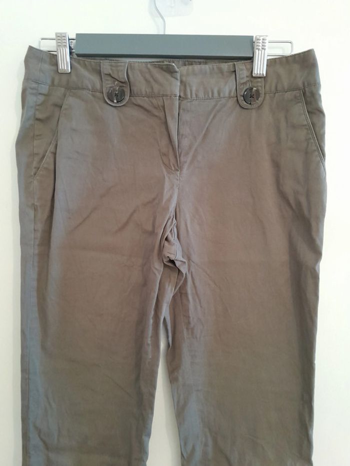 Pantalon femme Taille 38 - Marque Camaieu couleur kaki 2 poches à l'italienne devant+ 2 fausses poches à l'arrière passants avec boutons pour une ceinture revers sur le bas du pantacourt 97% Coton + 3% elasthanne extensible MESURES DU VETEMENT POSE A PLAT : Largeur taille : 38 cm hauteur totale : 79cm hauteur à partir de l'entrejambe : 56cm largeur des cuisses : 26,5 cm largeur du bas de jambe : cm