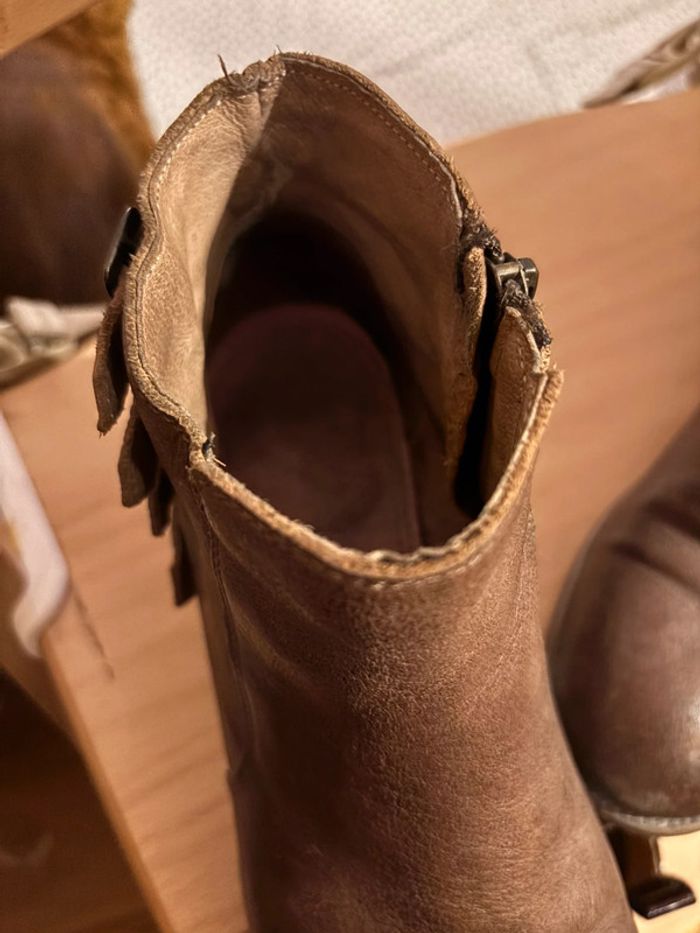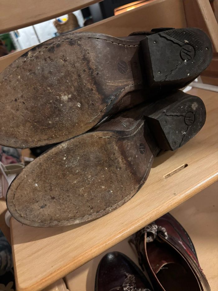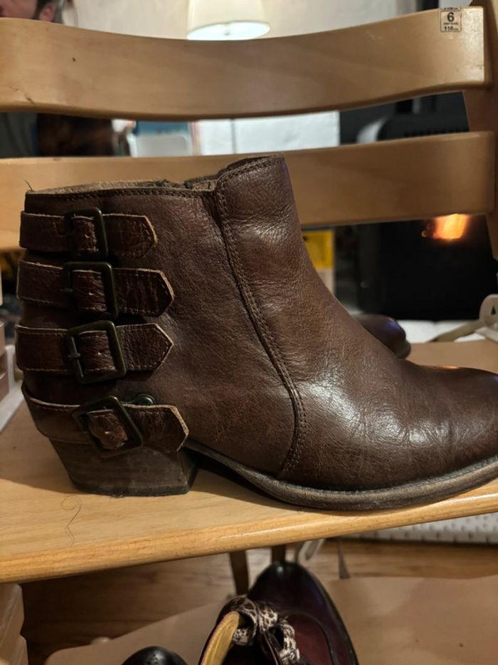 Bottines en cuir, à brides boucles à l’arrière. Vraiment très belles mais malheureusement trop juste pour moi. Taille 40
