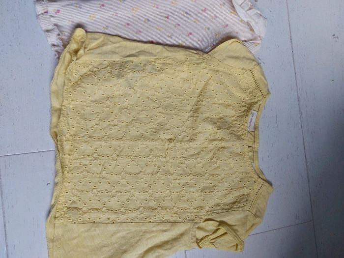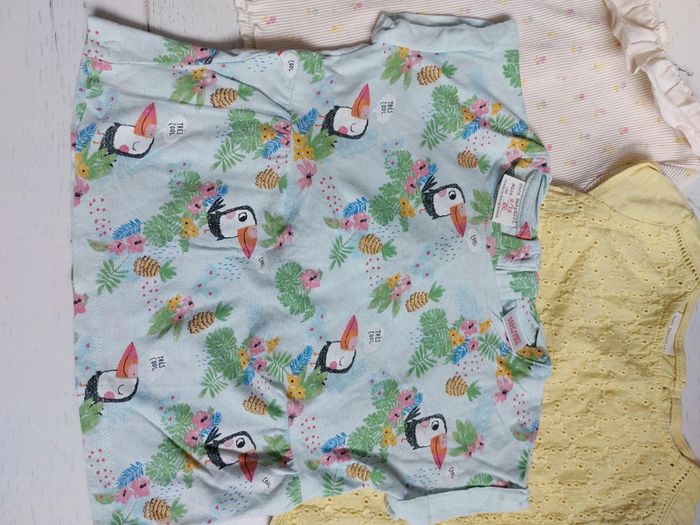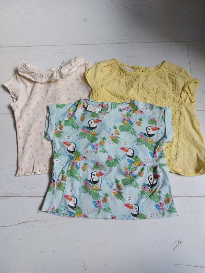 #victoireagrandi Lot de 3 t-shirts, Taille 9-12 mois : 1 jaune avec broderie Zara 1 imprimé tropical toucan Zara 1 à volant Kiabi