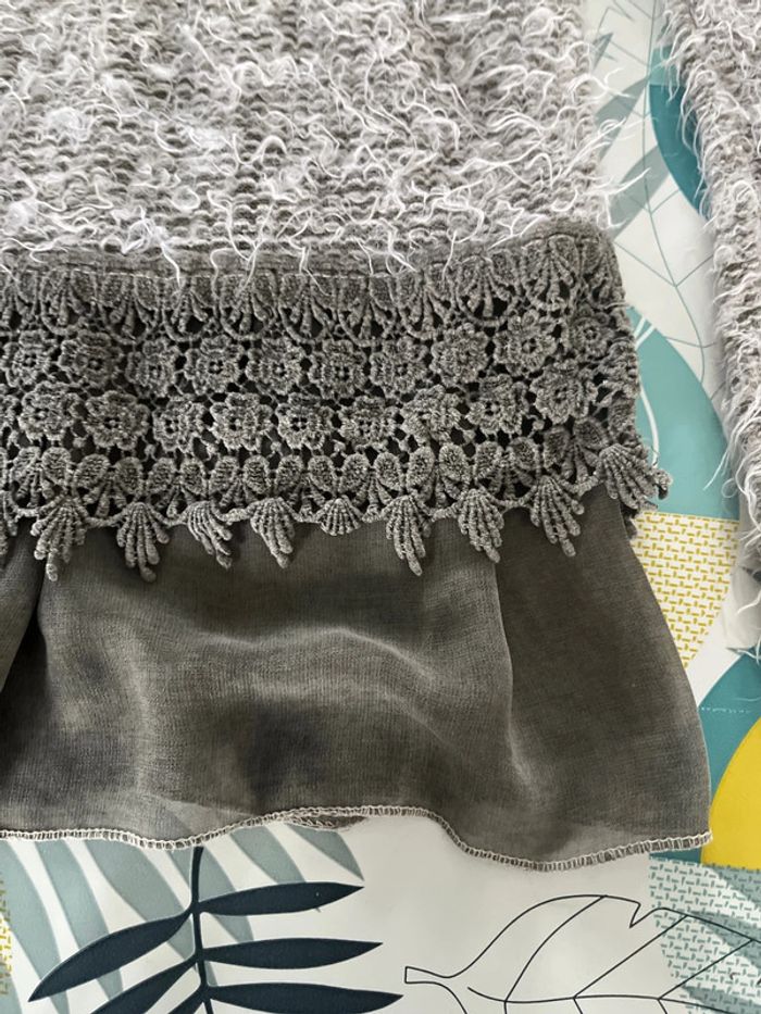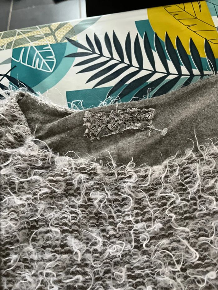 Joli pull mais je n’ai pas d’étiquette de taille ou marqué mais correspond à une taille 36 car aisselles à aisselles : 43 cm