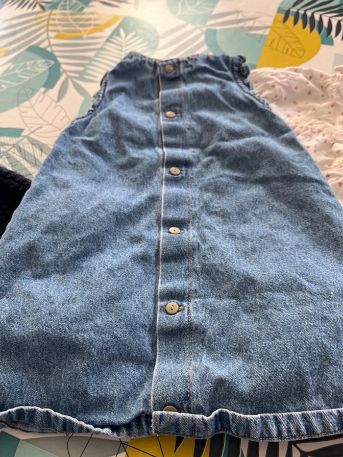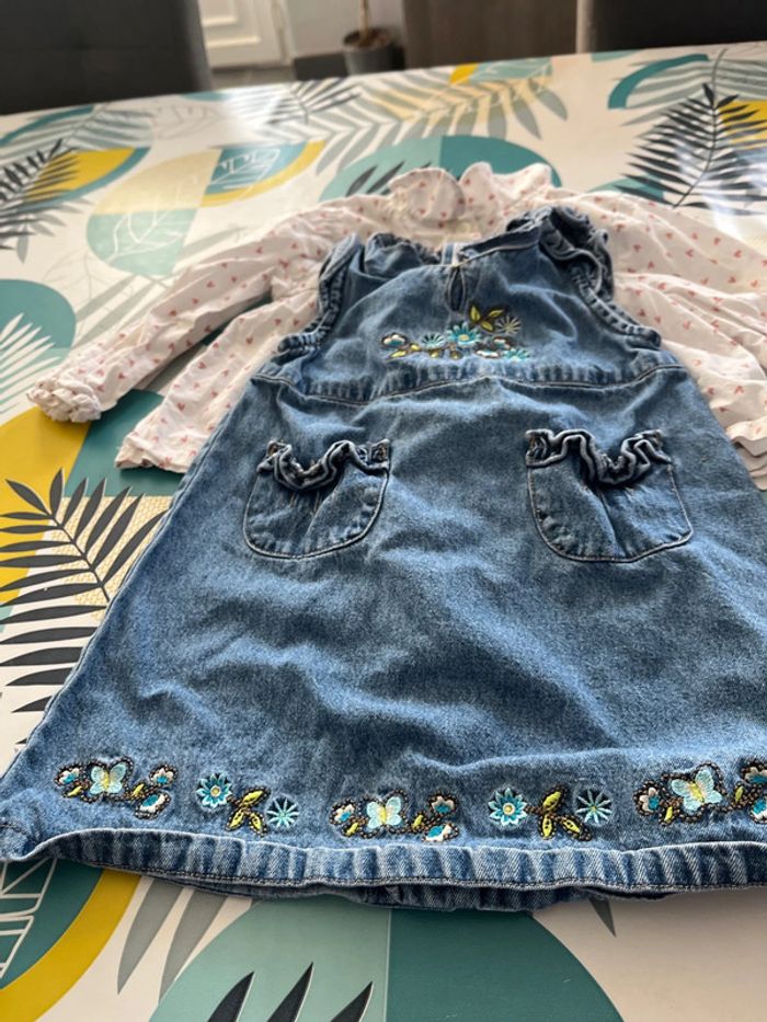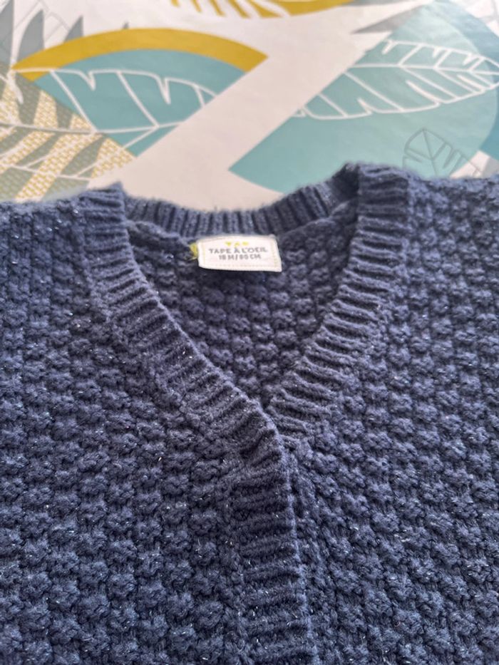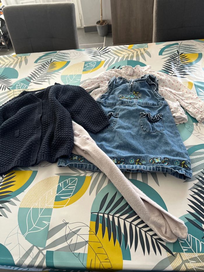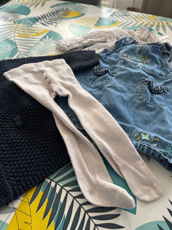 Lot 18 mois en bon état il y a un gilet effet pailleté tape à l’œil en bon état avec une robe en jeans marque kimbaloo en bon état un collant tape à l’œil en bon état les pieds sont légèrement taché et une blouse tex avec une micro tache à un manche voir photo