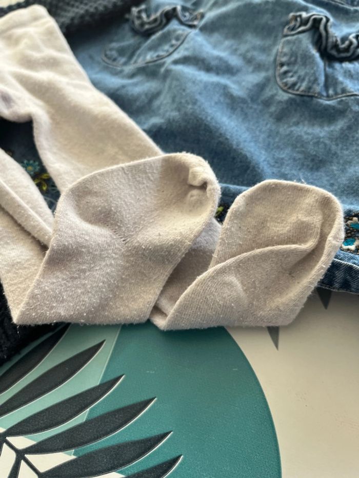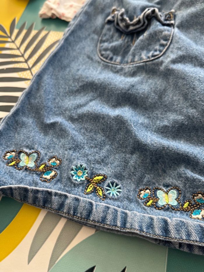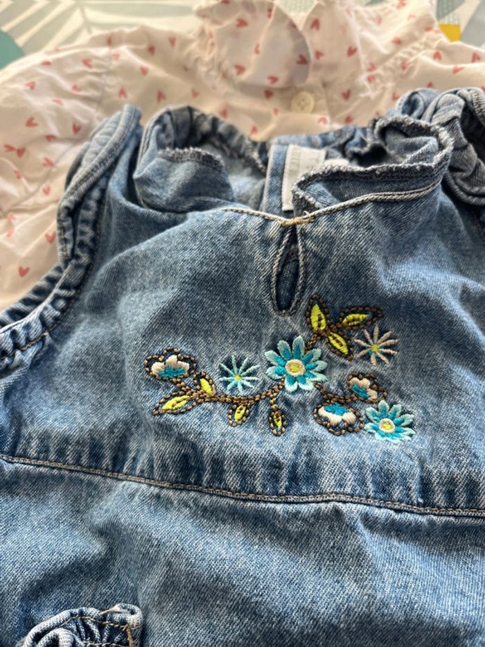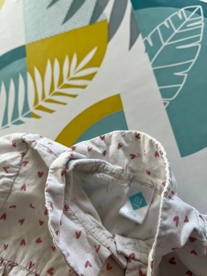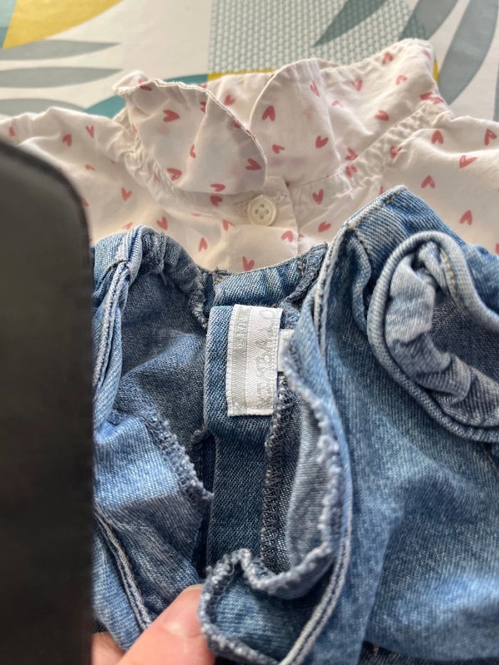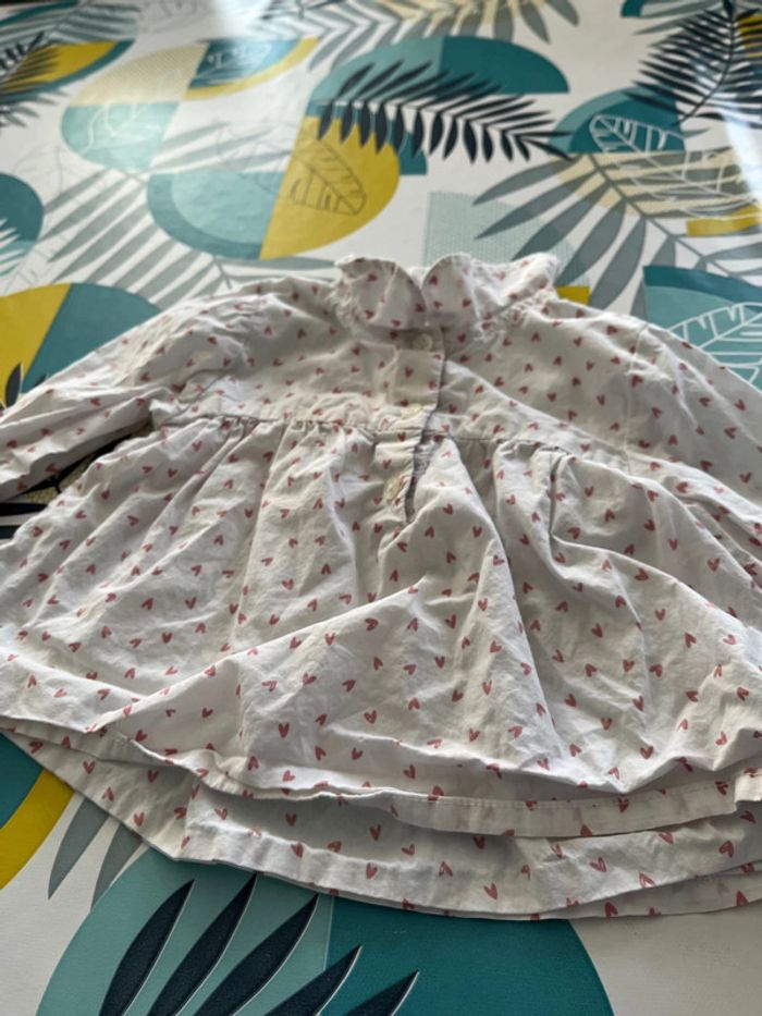 Lot 18 mois en bon état il y a un gilet effet pailleté tape à l’œil en bon état avec une robe en jeans marque kimbaloo en bon état un collant tape à l’œil en bon état les pieds sont légèrement taché et une blouse tex avec une micro tache à un manche voir photo