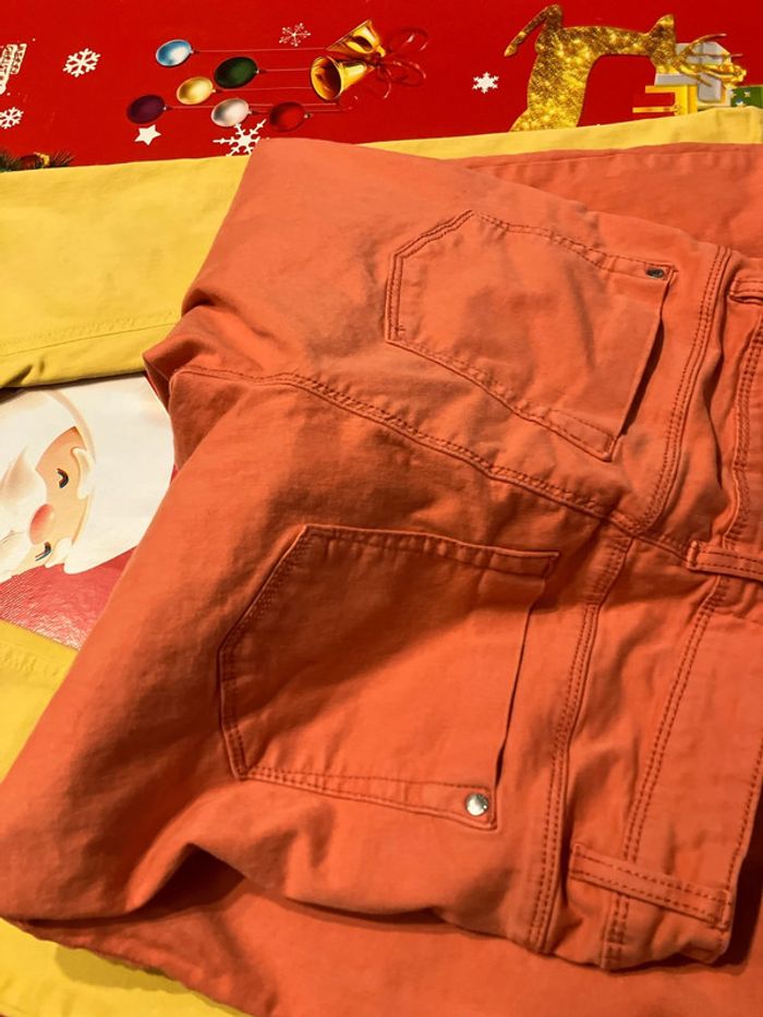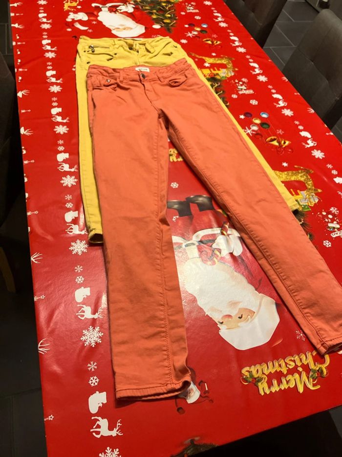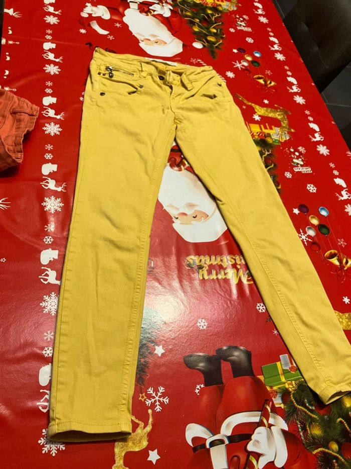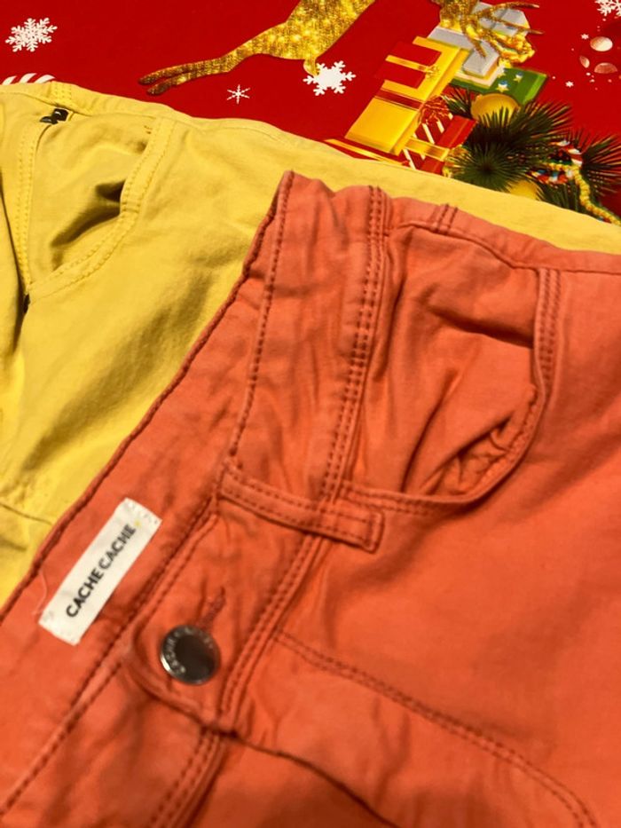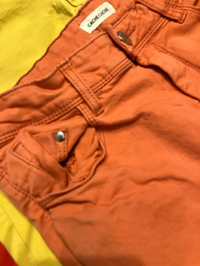 Jeans orange cache cache en bon état n’a plus d’étiquette de taille mais correspond à un S comme le jaune que j’offre en cadeau car à des petites taches