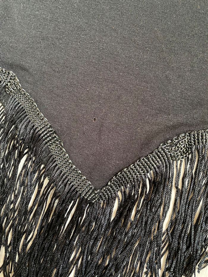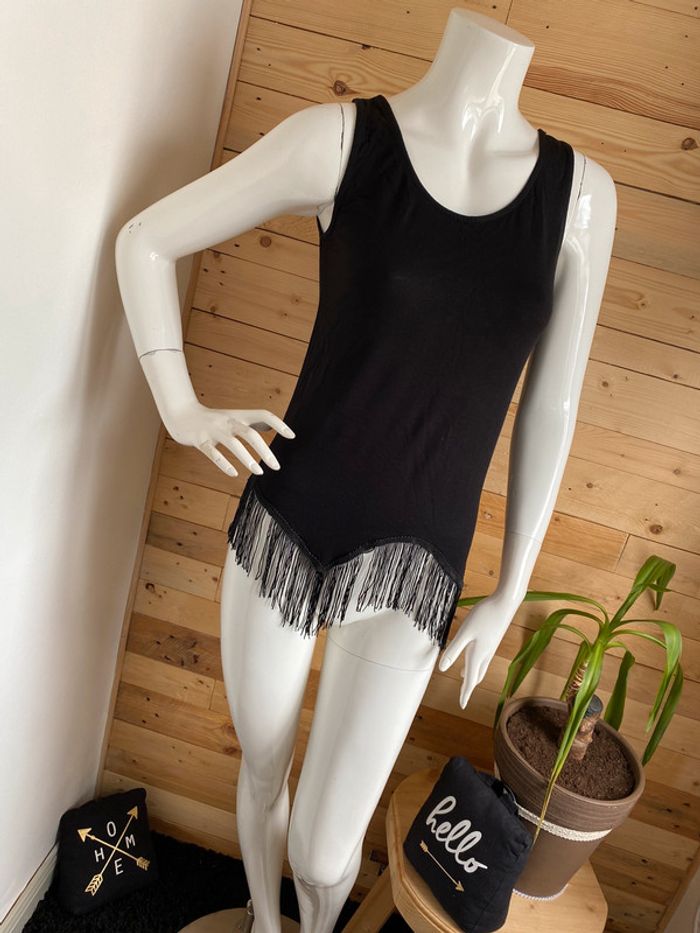 débardeur noir à franges juste un micro trou au niveau du bas voir photo 3 et manque quelques franges, d’où le prix 🙂 mim - taille S n’hésitez pas à créer un lot pour économiser les frais de ports et activer les réductions 🤗