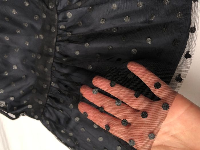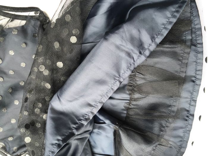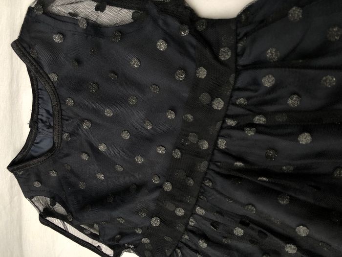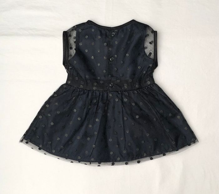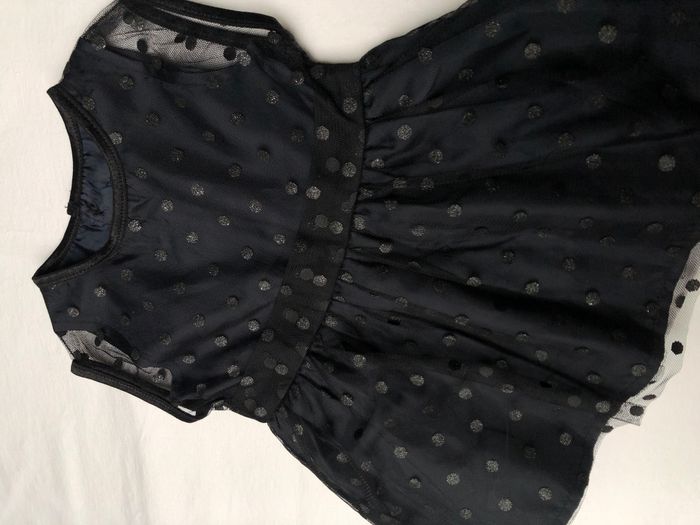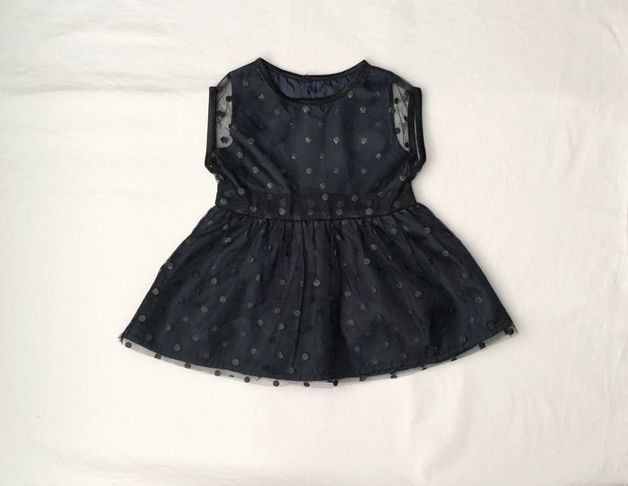 Robe Kiabi, Taille 6 mois/ 63-69 cm, Sans manches, Doublée. Superbe robe habillée, de soirée, cérémonie, Noël, fêtes de fin d'année…ou originale pour la vie de tous les jours. Doublure bleu marine très foncé recouverte de tulle à pois noirs discrètement pailletés. Le jupon est composé de trois couches : 1 doublure bordée d’une bande de tulle, 1 autre doublure, 1 couche de tulle. Pour marquer la taille il y a deux épaisseurs de tulle, pour un effet ruban/ceinture. Ouverture par boutons en haut du dos. Neuve, lavée mais jamais portée. 🌸 Vous aimez cet article ? N’oubliez pas de visiter le reste de mon dressing en filtrant les tailles.