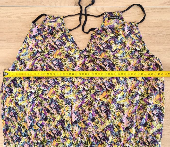 Très jolie robe d'été sans manches à motifs violet jaune et noir Bonobo Taille XS ou 36 Bien vérifier les photos des mesures à plat Aisselles 49cm Longueur 90cm Peut se porter avec une ceinture (la ceinture sur les photos n'est pas à vendre) Réglable au niveau du décolleté avec les liens, pratique pour adapter selon la poitrine Légère fluide et agréable à porter Très gaie pour l'été avec ses couleurs vives En très bon état #matka27_taille36 #taille36 #bonobo #robe #été #débardeur #sansmanches