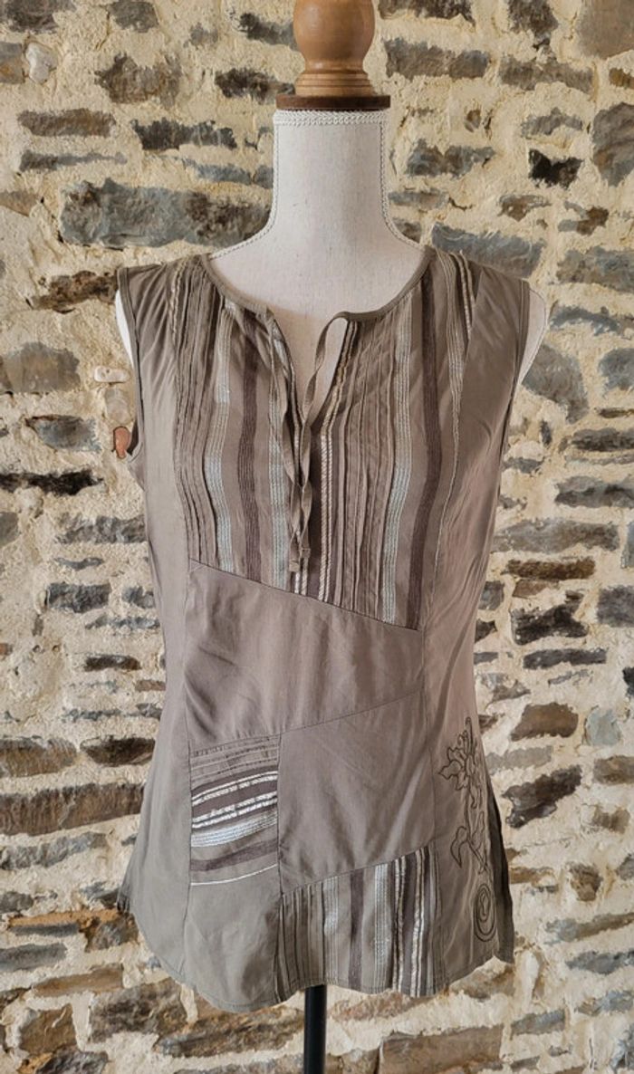 Joli débardeur kaki à motifs brodés Cache Cache Taille 1 ou 34 Aisselles 46cm Longueur 66cm devant 69cm derrière En très bon état #matka27_taille34 #taille34 #débardeur #cachecache #été #kaki #motifs #fleurs #broderie