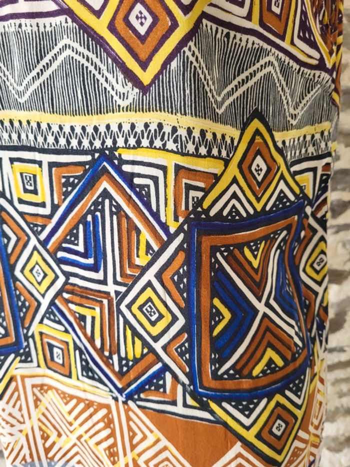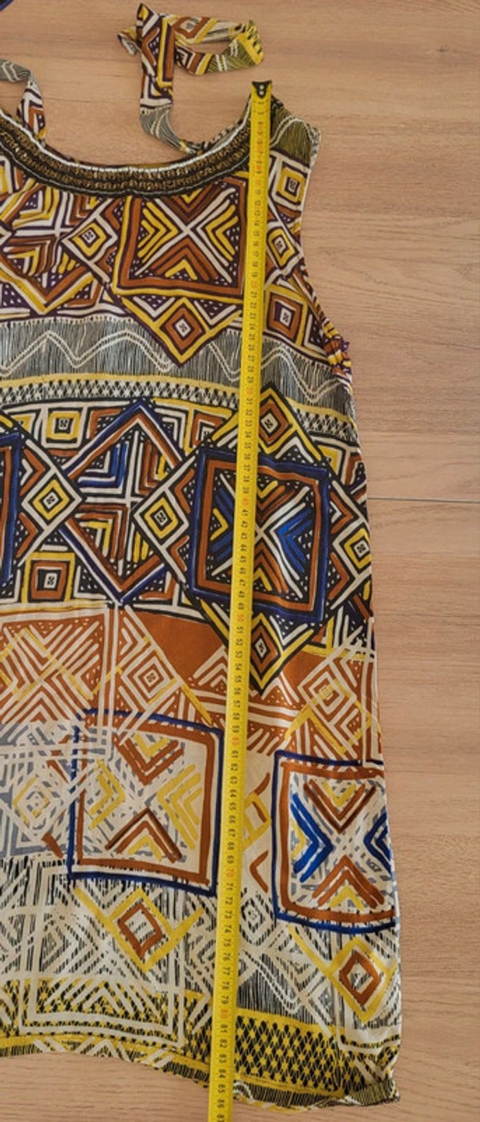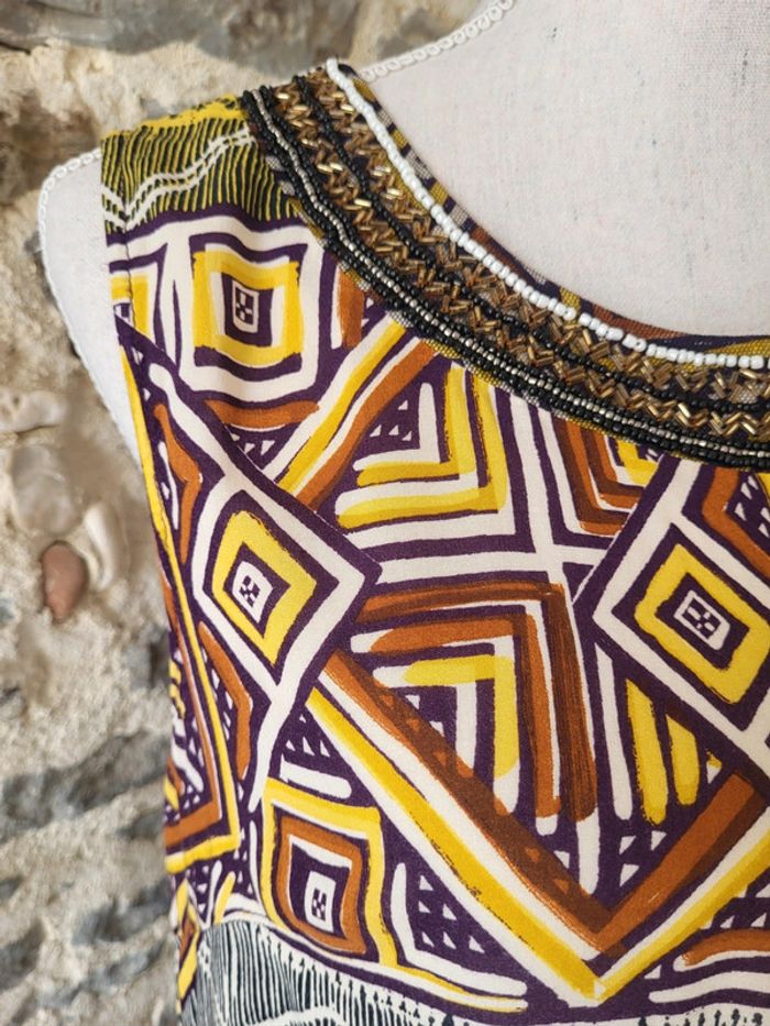 Très jolie robe débardeur à motifs ethniques marron jaune bleu Perles au niveau du cou Taille 38 Aisselles 49cm Longueur 85cm Lien à nouer dans le dos En viscose En très bon état #matka27_taille38 #taille38 #robedébardeur #motifs #ethnique #été #jaune #marron #bleu #perles #robe
