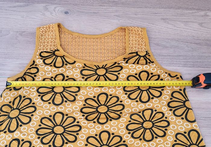 Très joli débardeur à motifs fleurs jaune moutarde Détails au crochet sur les épaules et dans le dos Made in Italy Taille 44 Aisselles 55cm Longueur 65cm En viscose et elastane, extensible Très légère fluide et agréable à porter, gaie pour l'été Porté quelques fois mais toujours très bien #matka27_taille44 #taille44 #madeinitaly #blouse #débardeur #jaune #moutarde #fleurs #été