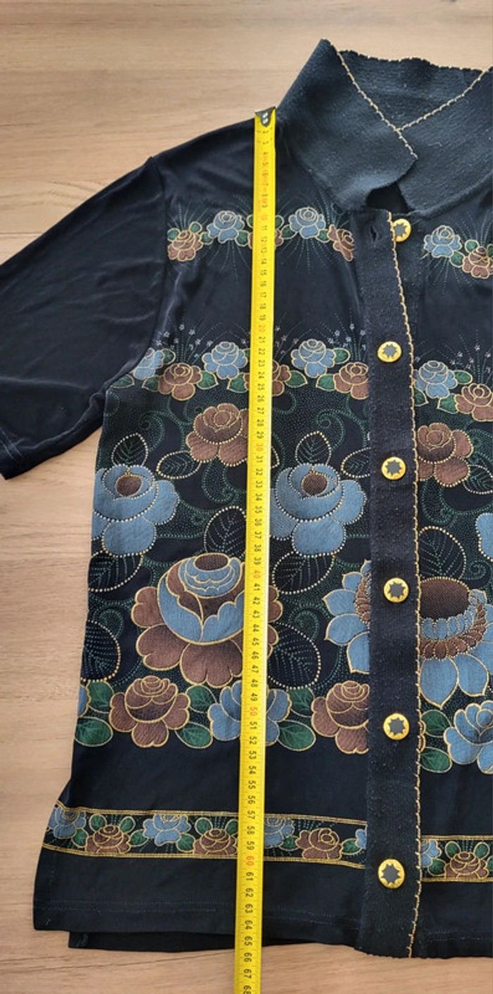 Blouse manches courtes forme gilet en tissu léger Jolis boutons dorés et noirs Tissu très extensible Motifs fleurs imprimés en relief sur le tissu Esprit vintage, asiatique Made in Korea Carure 43cm Aisselles 50cm Longueur 65cm Déchirure sur l'épaule droite facilement réparable (voir dernière photo) Reste malgré tout en très bon état #matka27_taille40 #taille40 #blouse #gilet #manchescourtes #noir #doré #motifs #fleurs #madeinkorea #vintage