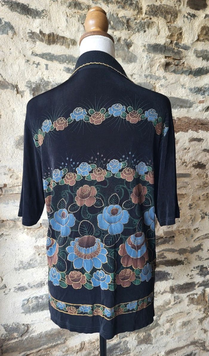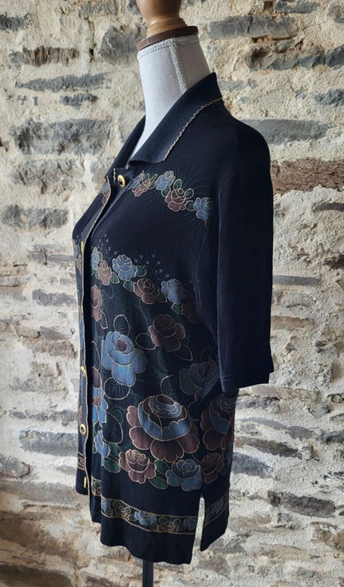 Gilet léger style blouse vintage motifs fleurs en relief noir doré bleu Taille 40 - photo numéro 11