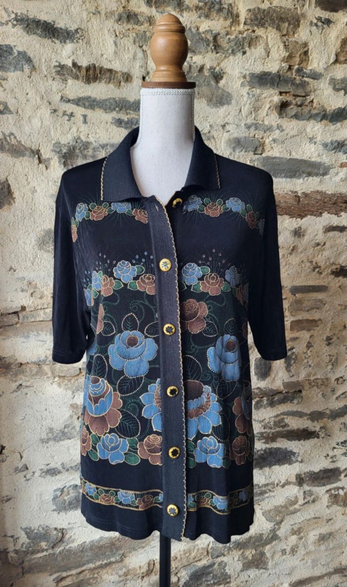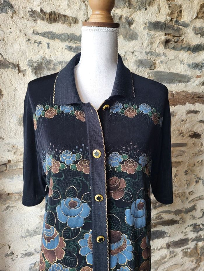 Gilet léger style blouse vintage motifs fleurs en relief noir doré bleu Taille 40 - photo numéro 1