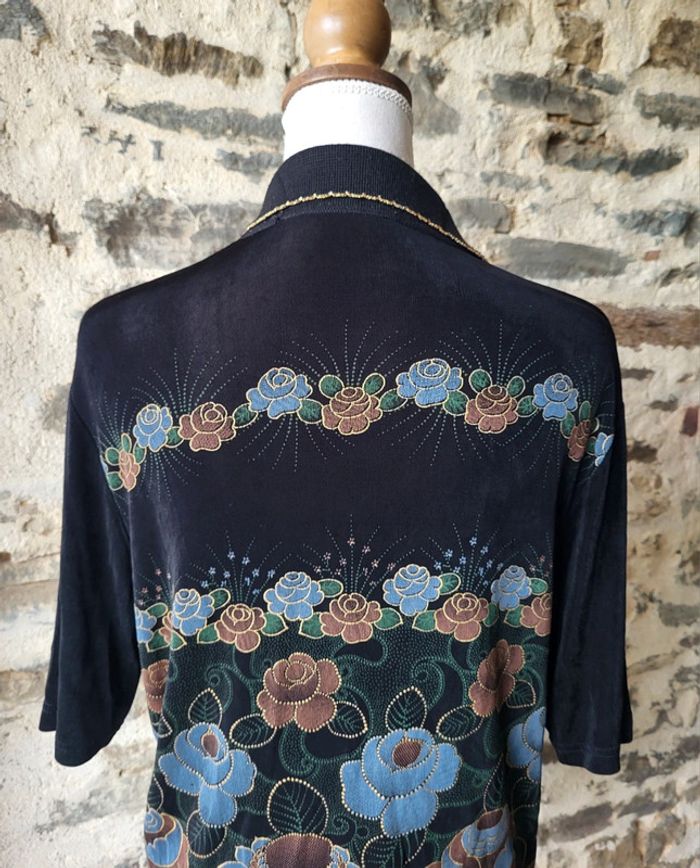 Gilet léger style blouse vintage motifs fleurs en relief noir doré bleu Taille 40 - photo numéro 10