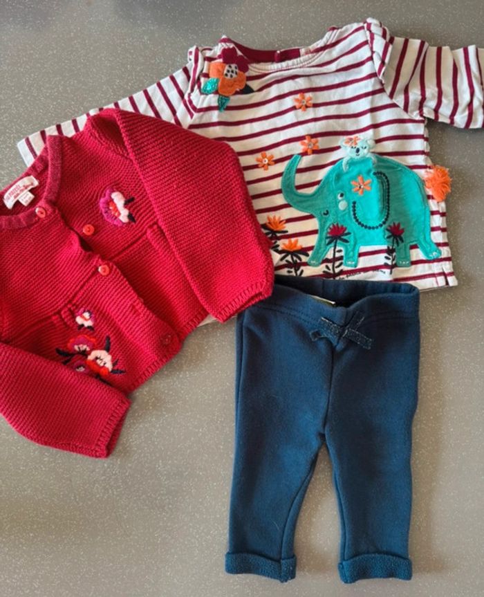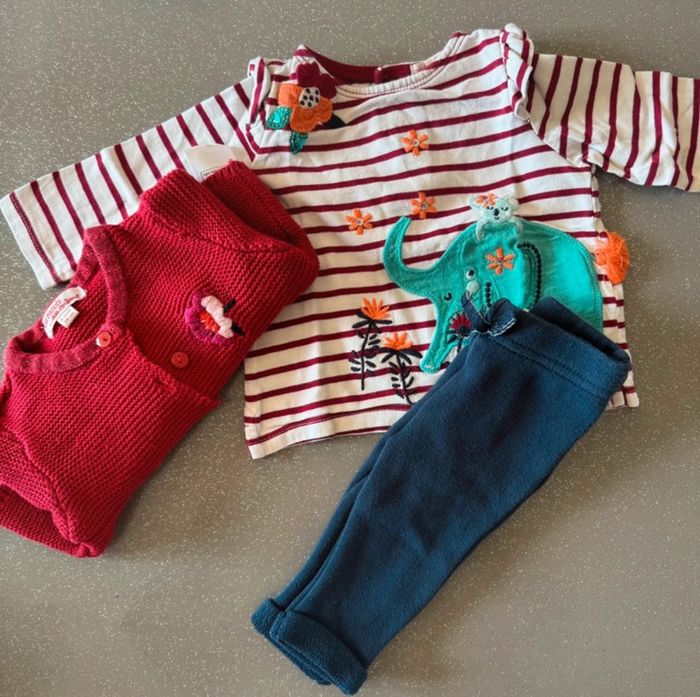 Ensemble 3 mois Joli lot de vêtements (tenue complète) en 3 mois 1 pantalon TAO - 3 mois (59 cm) - coton 1 tee shirts ML DPAM - 3 mois - coton 1 gilet rouge DPAM - 3 mois - maille En parfait état, idéal pour la saison actuelle. #jamaub3moisfille #dpamfille #bebe3mois