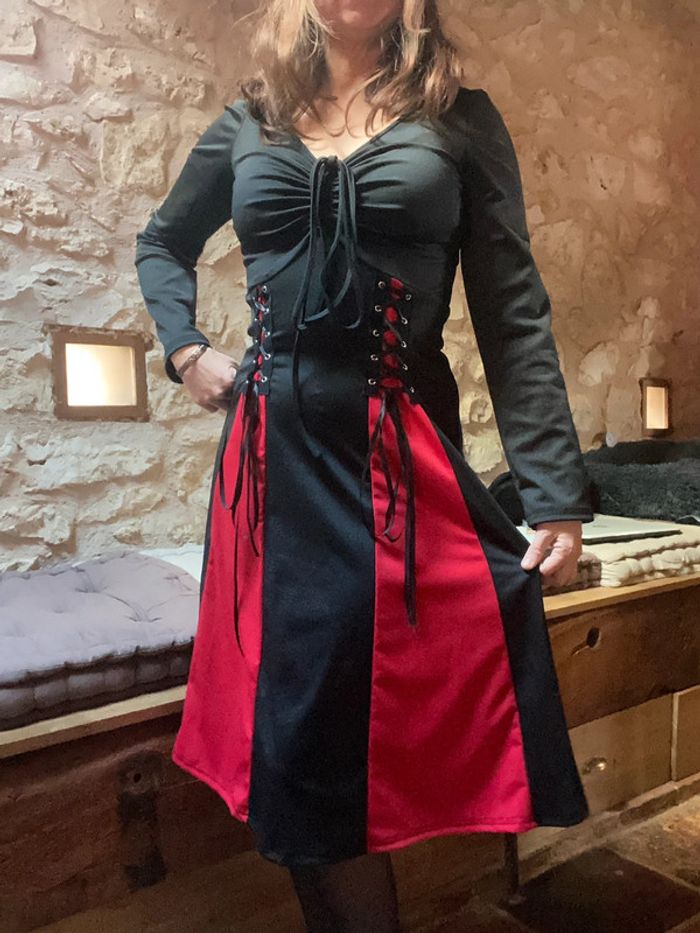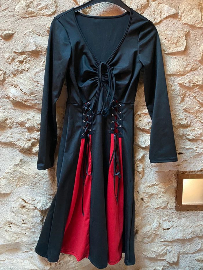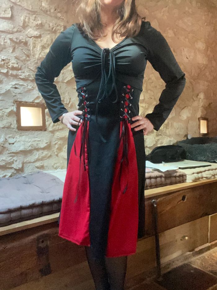 Robe style vintage, noire et rouge, taille S Joli décolleté réglable grâce au lacet. Magnifique laçage sur les côtés qui permet également un réglage au niveau de la taille. Noté taille S mais convient très bien à une taille M car le tissu est élastique. Portée une fois juste pour les photos Médiéval, pirate, gothique chic, sexy
