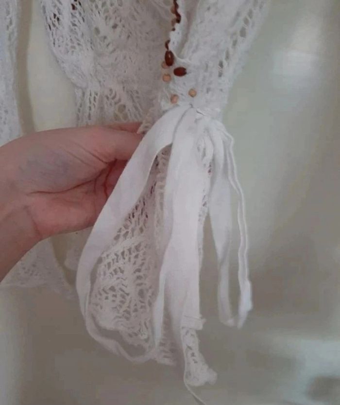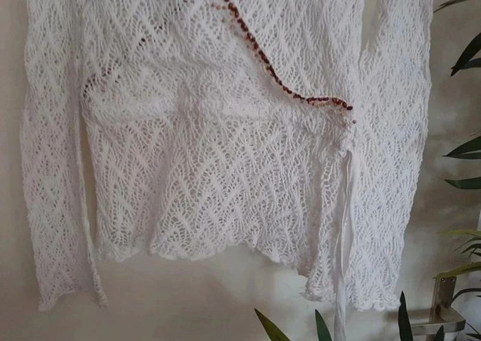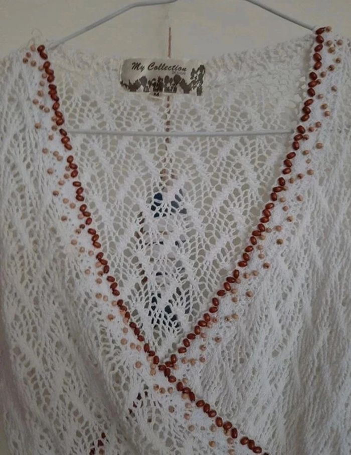 Pull en maille blanc. Se resserre comme on veut à la taille. Décolleté. Bordé de petites perles/coquillages bruns. Très bon état taille M. Je le vends au prix de 14 euros. #TailleM38marine