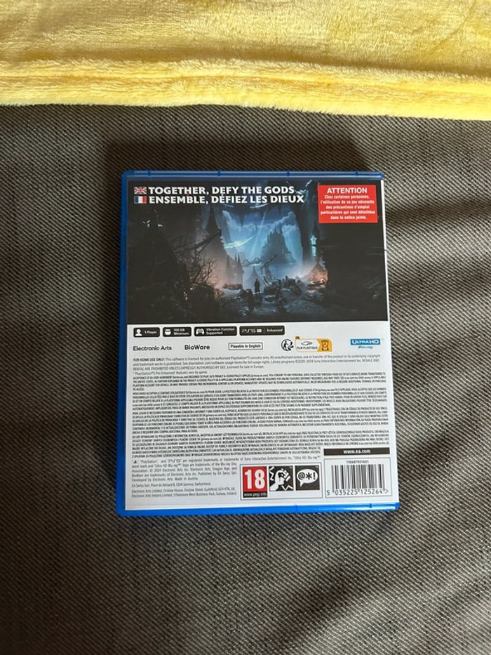Ce jeu vidéo est un JDR (jeu de rôle) solo immersif dans lequel vous deviendrez une icône inspirant le respect; Unissez la Garde du Voile et défiez les dieux dans Dragon Age: The Veilguard SAUVEZ UN MONDE RAVAGÉ : Entrez dans Thédas, une terre rude et sauvage aux labyrinthes inextricables et de villes étincelantes; Le destin de ce monde ne tient qu'à un fil, tandis que les dieux corrompus sèment le chaos sur tout le continent Unissez la GARDE DU VOILE : Unissez une équipe de sept compagnons chacun ayant sa propre histoire et un riche passé; Parmi eux un assassin, un nécromancien et une détective apporteront chacun leur propre expertise et leurs capacités uniques au combat INSPIREZ VOTRE ÉQUIPE ET MENEZ-LA AU COMBAT : Choisissez entre différentes races et classes de combat, personnalisez votre apparence, déterminez l’histoire de votre personnage et incarnez Rook pour ajouter une nouvelle page à l'épopée Dragon Age ADOPTEZ VOTRE PROPRE STYLE DE JEU : Pendant votre aventure, vous obtiendrez de nouvelles capacités et découvrirez de puissants artefacts uniques pour améliorer votre style de combat; Préparez-vous Détails sur le produit Classé : 18 ans et plus Très bon état Très peu servi
