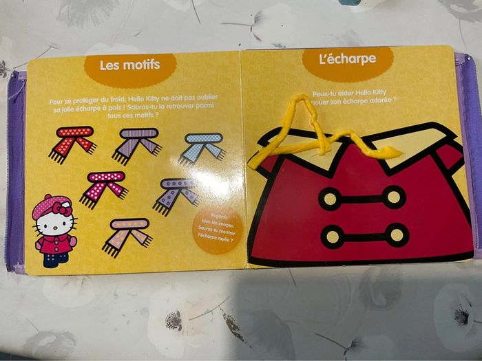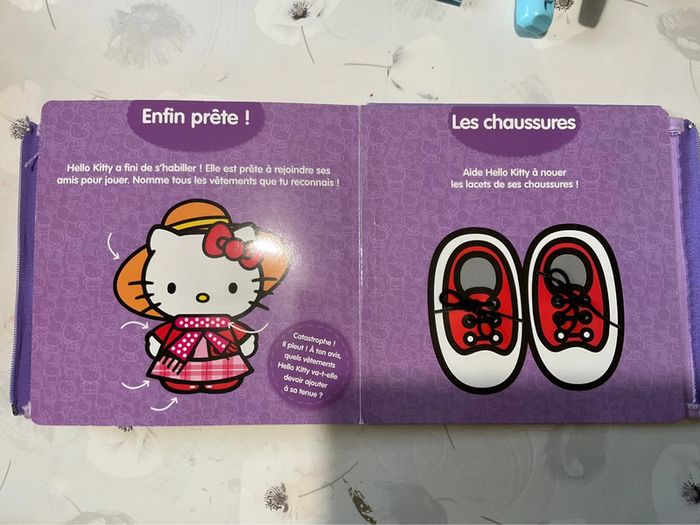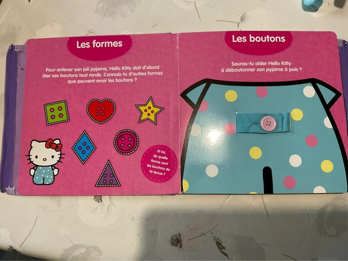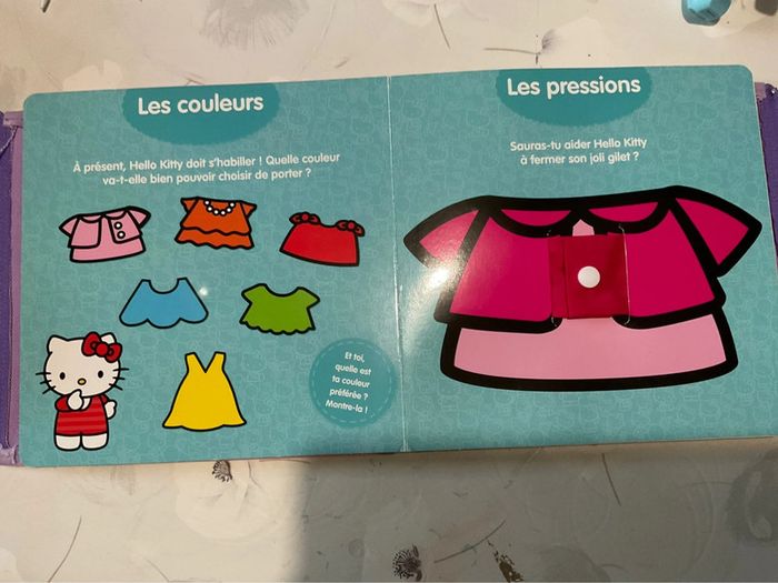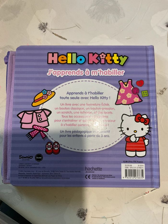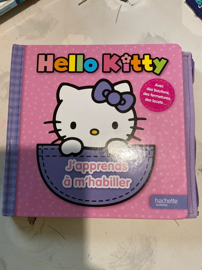 Apprends à habiller toute seule avec Hello Kitty ! Un livre avec une fermeture Eclair, un bouton classique, un bouton-pression, un scratch, une écharpe, et des lacets. Tous les accessoires nécessaires pour s'entraîner et apprendre en douceur à s'habiller comme une grande ! Un livre pédagogique et interactif pour les enfants à partir de 3 ans. Bon état général, quelques petites marques. #liliefushialivres