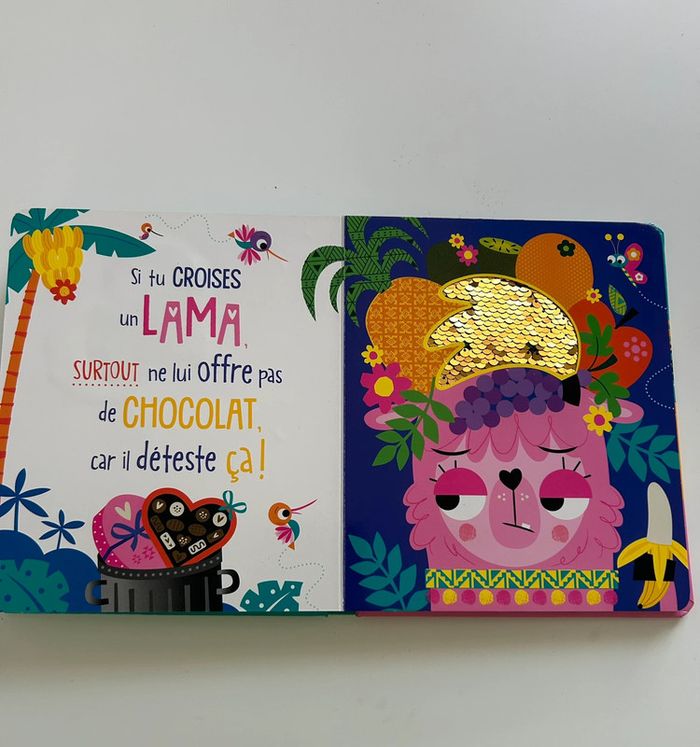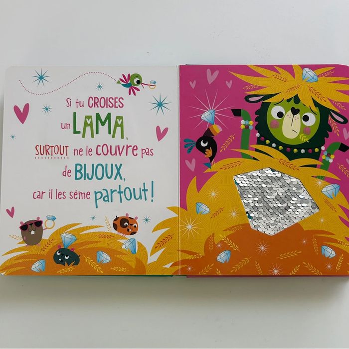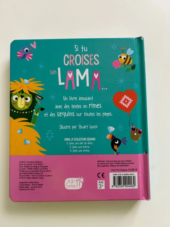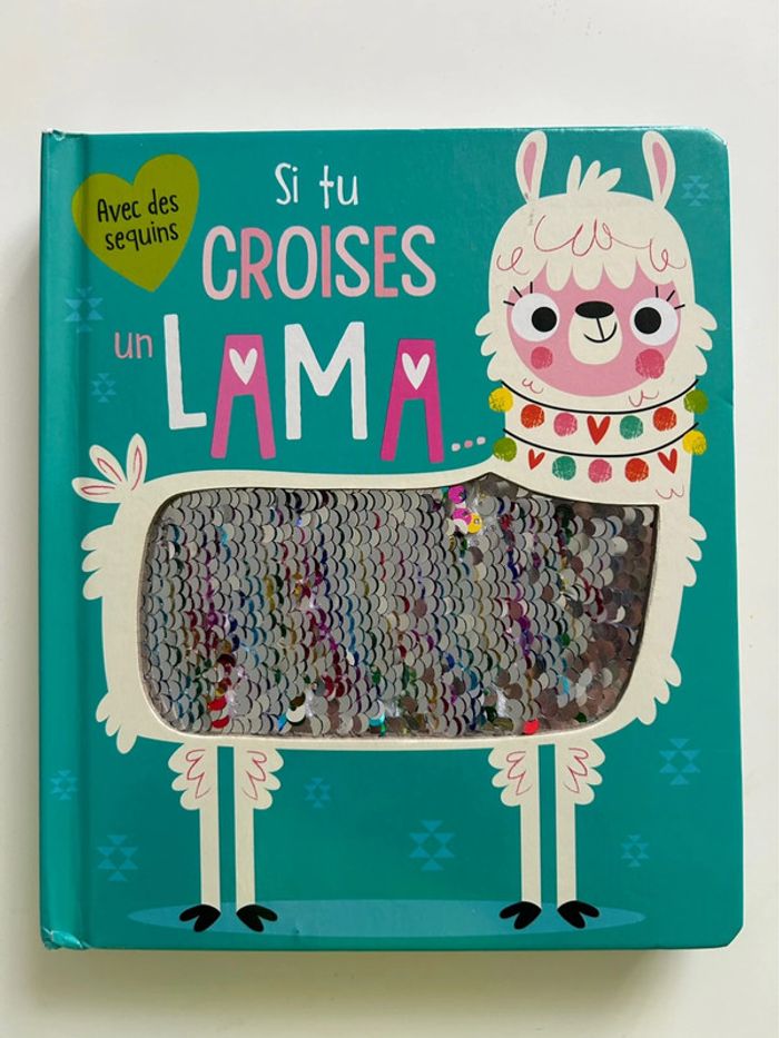 « Si tu croises un lama » Un livre amusant avec des textes en rimes et des sequins sur toutes les pages. Très bon état général, quelques marques sur l’extérieur du livre.(voir photos) #liliefushialivres