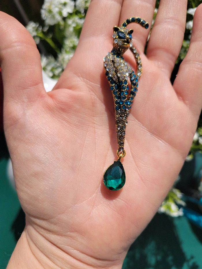 Broche chat multicolore et pampille verte - photo numéro 3