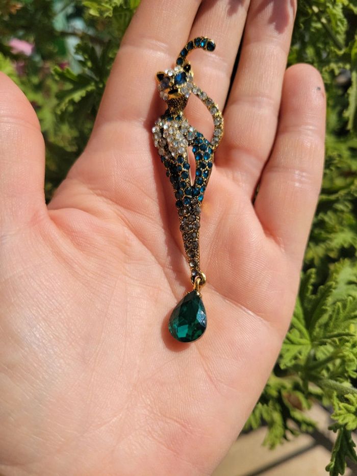 Broche chat multicolore et pampille verte