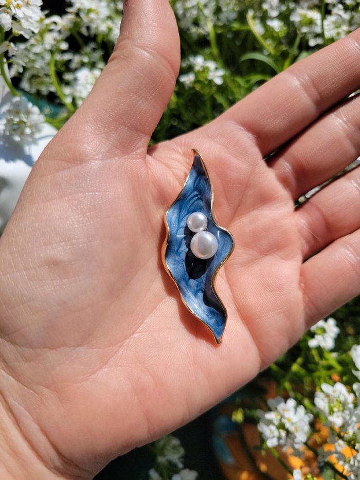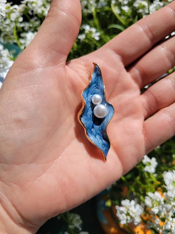 Broche feuille bleue et perles blanches