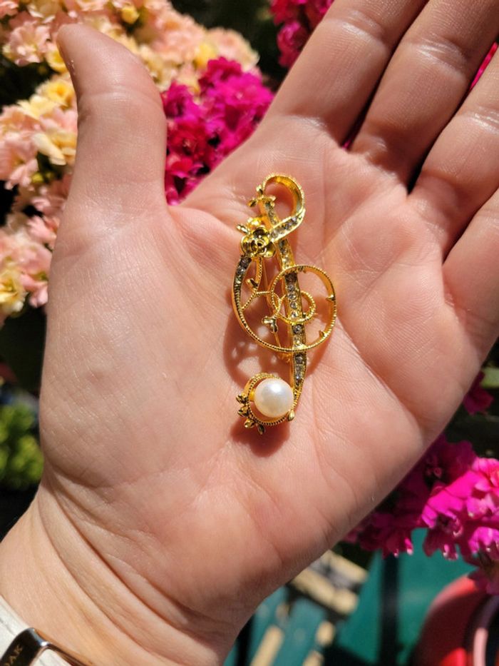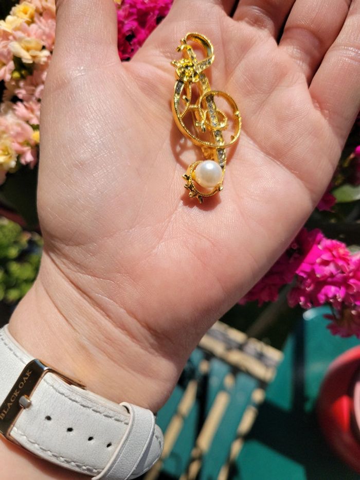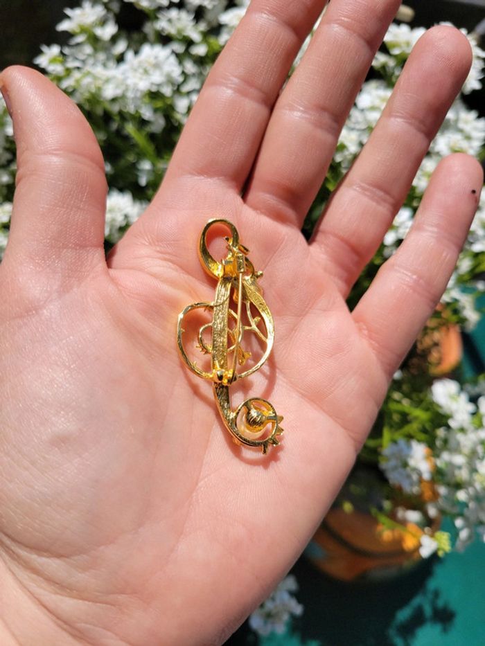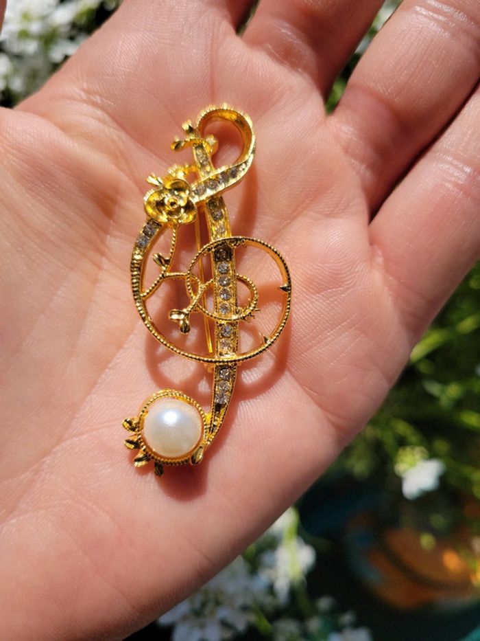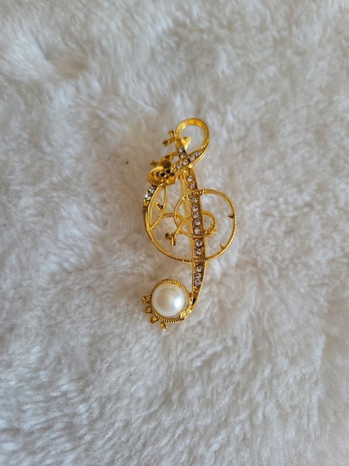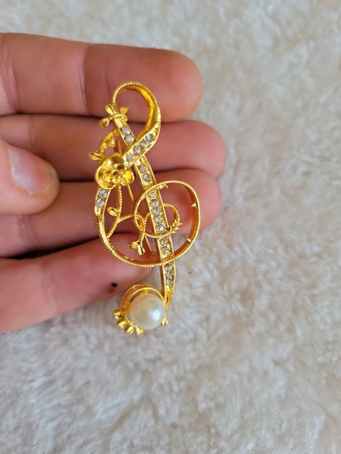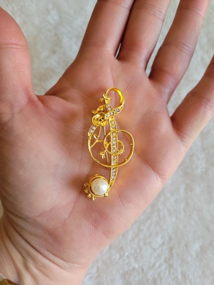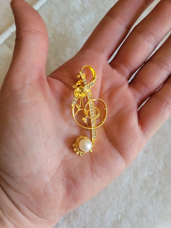 Broche musique dorée, stass et perle blanche. A porter sur vos vêtements, sacs, chapeaux ou autres. Celle ci egayera vos tenues. Neuve. D autres modèles dispo dans mon dressing 👗.....lot possible avec # articles de mon dressing... Envoi sous 24h_48h. Soigné