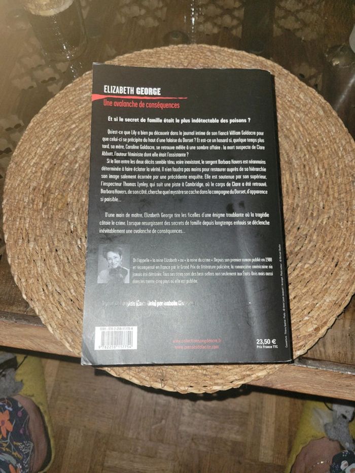 ELIZABETH GEORGES. 612 pages. Tres bon état. Et si le secret de famille était le plus indétectable des poisons ? Qu'est-ce que Lily a bien pu découvrir dans le journal intime de son fiancé William Goldacre pour que celui-ci se précipite du haut d'une falaise du Dorset ? Et est-ce un hasard si, quelque temps plus tard, sa mère, Caroline Goldacre, se retrouve mêlée à une sombre affaire : la mort suspecte de Clare Abbott, l'auteur féministe dont elle était l'assistante ? Si le lien entre les deux décès semble ténu, voire inexistant, le sergent Barbara Havers est néanmoins déterminée à faire éclater la vérité. Il n'en faudra pas moins pour restaurer auprès de sa hiérarchie son image salement écornée par une précédente enquête. Elle est soutenue par son supérieur, l'inspecteur Thomas Lynley, qui suit une piste à Cambridge, où le corps de Clare a été retrouvé. Barbara Havers, de son côté, cherche quel mystère se cache dans la campagne du Dorset, d'apparence si paisible... D'une main de maître, Elizabeth George tire les ficelles d'une énigme troublante où la tragédie côtoie le crime. Lorsque resurgissent des secrets de famille depuis longtemps enfouis se déclenche inévitablement une avalanche Tres bon état Envoi rapide et soigné 24h_48h Lot possible sur demande