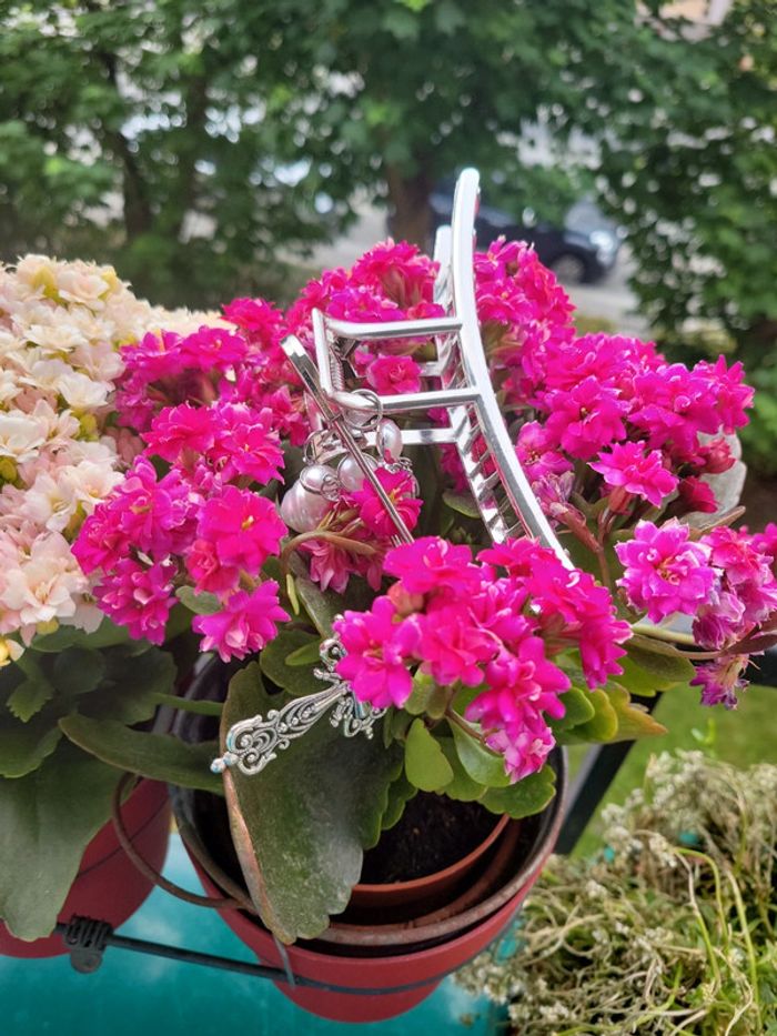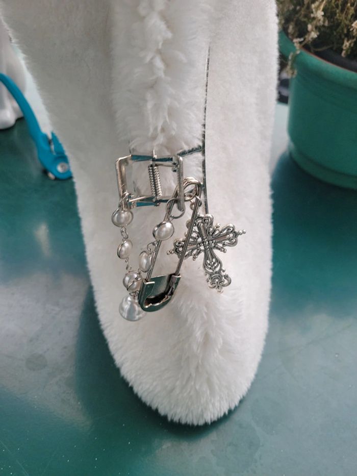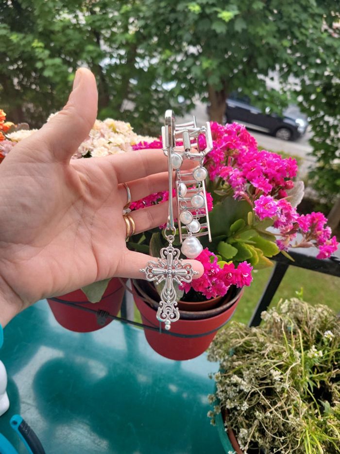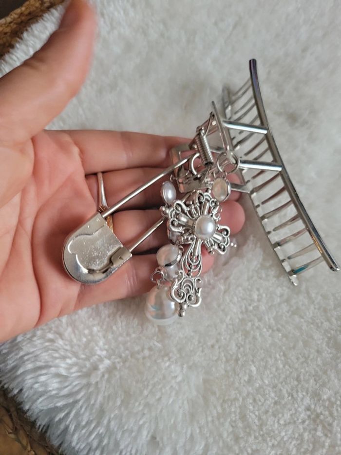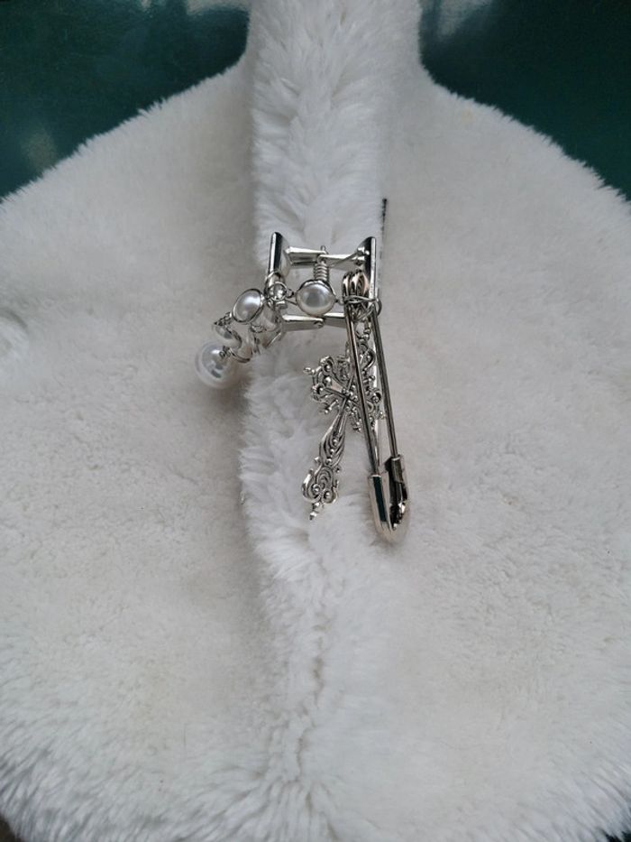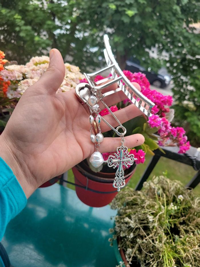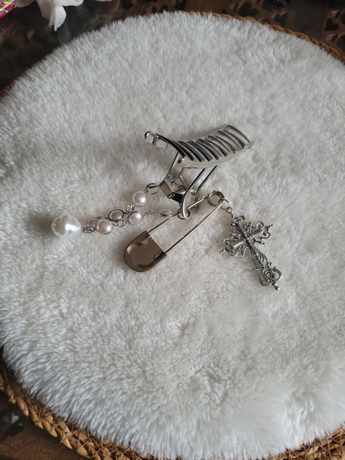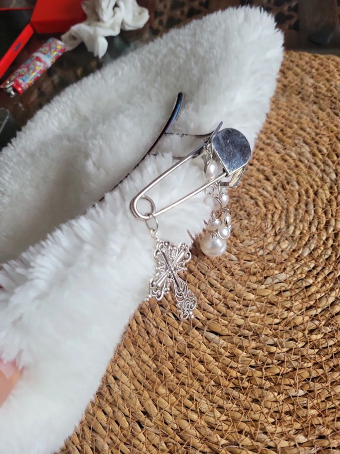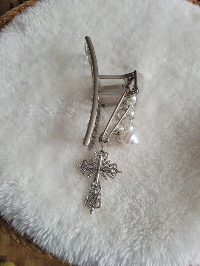Pince a cheveux" barock....". Acier silver, chaîne maillon et perles blanches, croix catholique et epingle à nourrice.... Maintient parfaitement les cheveux. Neuve. Envoi sous 24h_48h.