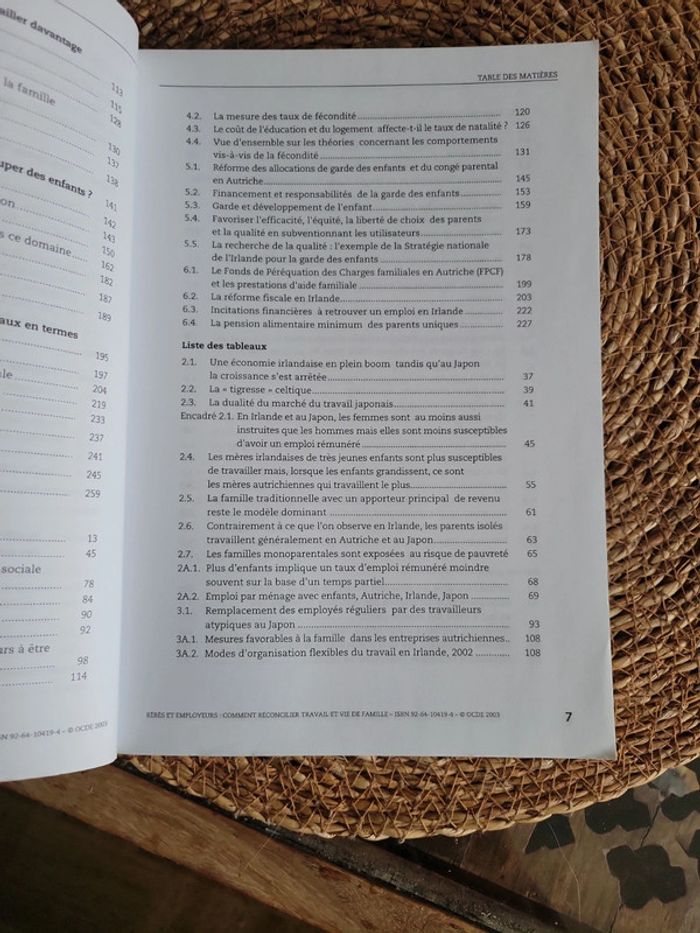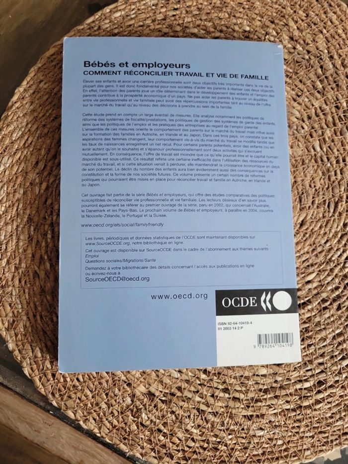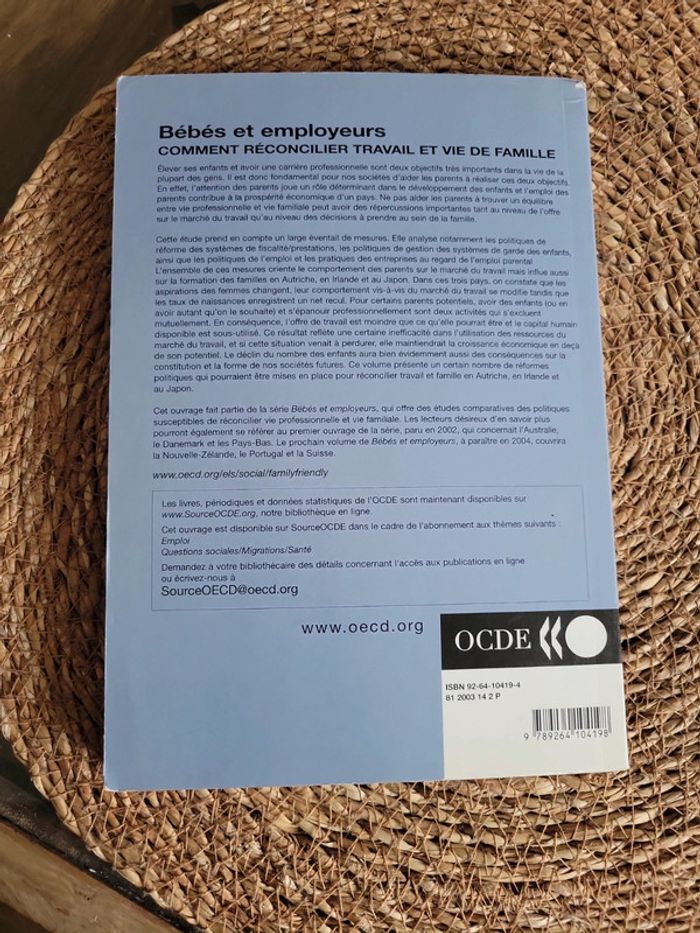 Comment réconcilier travail et vie de famille. Volume 2. Autriche, Irlande et Japon. Cet ouvrage analyse un large éventail de mesures existantes : les politiques de réforme des systèmes de fiscalité / prestations, les politiques de gestion des systèmes de garde des enfants, ainsi que les politiques de l'emploi et les pratiques professionnelles des entreprises. Il montre comment ces mesures orientent le comportement des parents sur le marché du travail actuel et à plus long terme et en quoi elles peuvent avoir des répercussions sur le développement de la famille. Ce volume traite du Canada (notamment de la Province de Québec), de la Finlande, du Royaume-Uni et de la Suède et analyse un large éventail de mesures des politiques en faveur de la réconciliation entre vie professionnelle et vie familiale dans les quatre pays en question. Cet ouvrage fait partie de la série Bébés et Employeurs parue en 2002 et qui concernait l'Australie, le Danemark, et les Pays-Bas ; suivi du second volume publié en 2003 sur l'Autriche, l'Irlande et le Japon, et du troisième volume publié en 2004 sur la Nouvelle-Zélande, le Portugal et la Suisse. Un rapport de synthèse paraîtra plus tard en 2005 : il présentera des indicateurs clés sur les politiques en faveur des familles Valeur 29e Envoi rapide et soigné 24h_48h Lot possible sur demande
