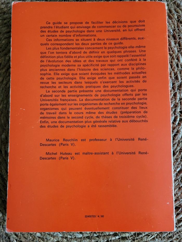Source d'informations pour l'étudiant qui veut entreprendre ou poursuivre des études en psychologie. Deux parties: 1. La psychologie: définition, évolution, méthodes, domaines. Les sources bibliographiques sont intégrées au texte; à la fin de chaque chapitre, un complément bibliographique est ajouté Rare. Tres bon état. Envoi rapide et soigné 24h_48h Lot possible sur demande