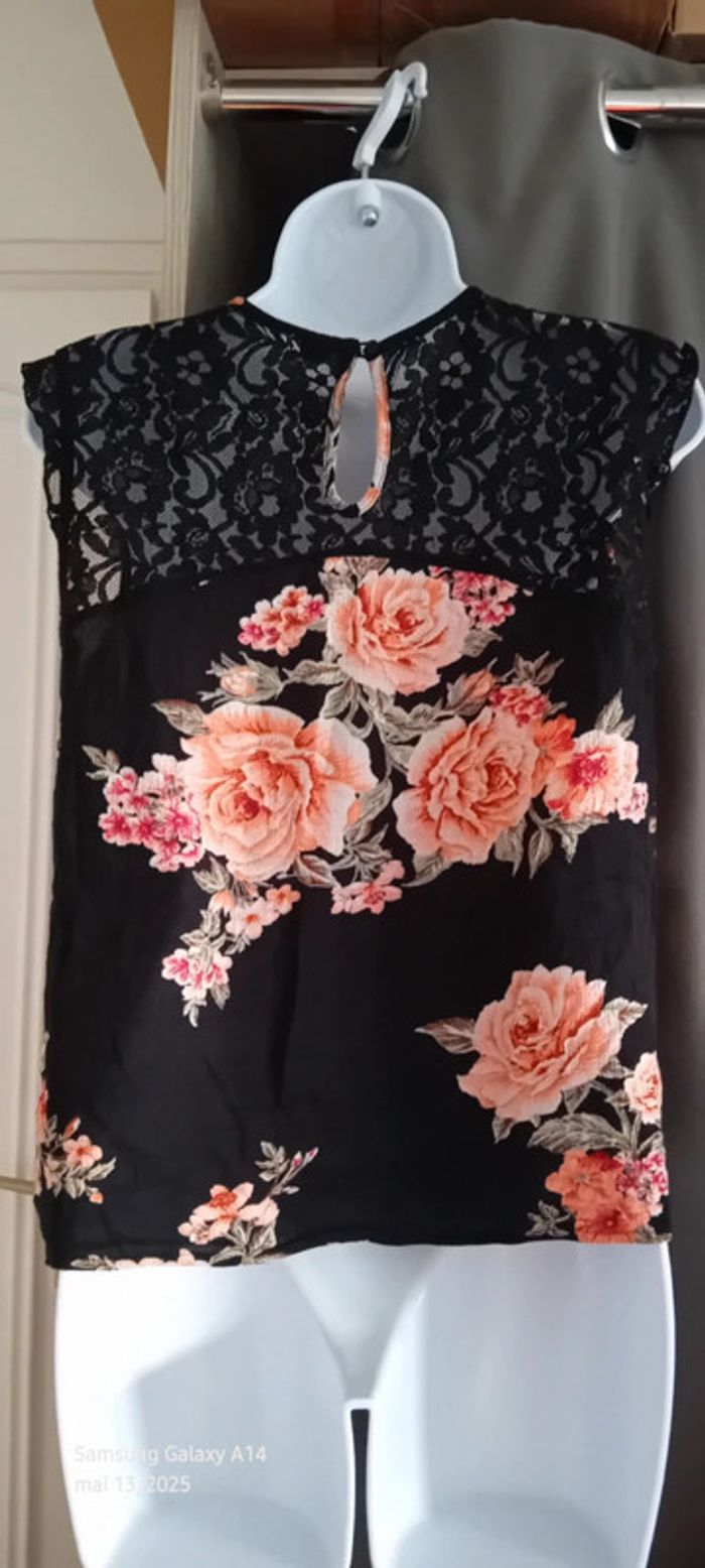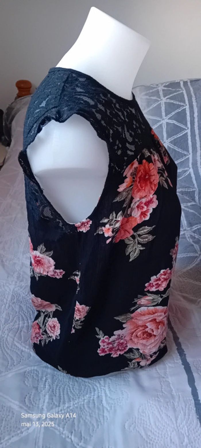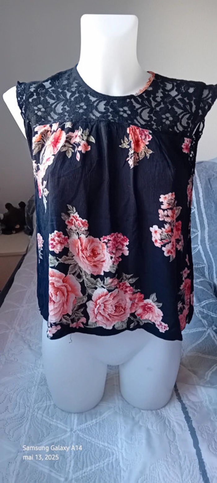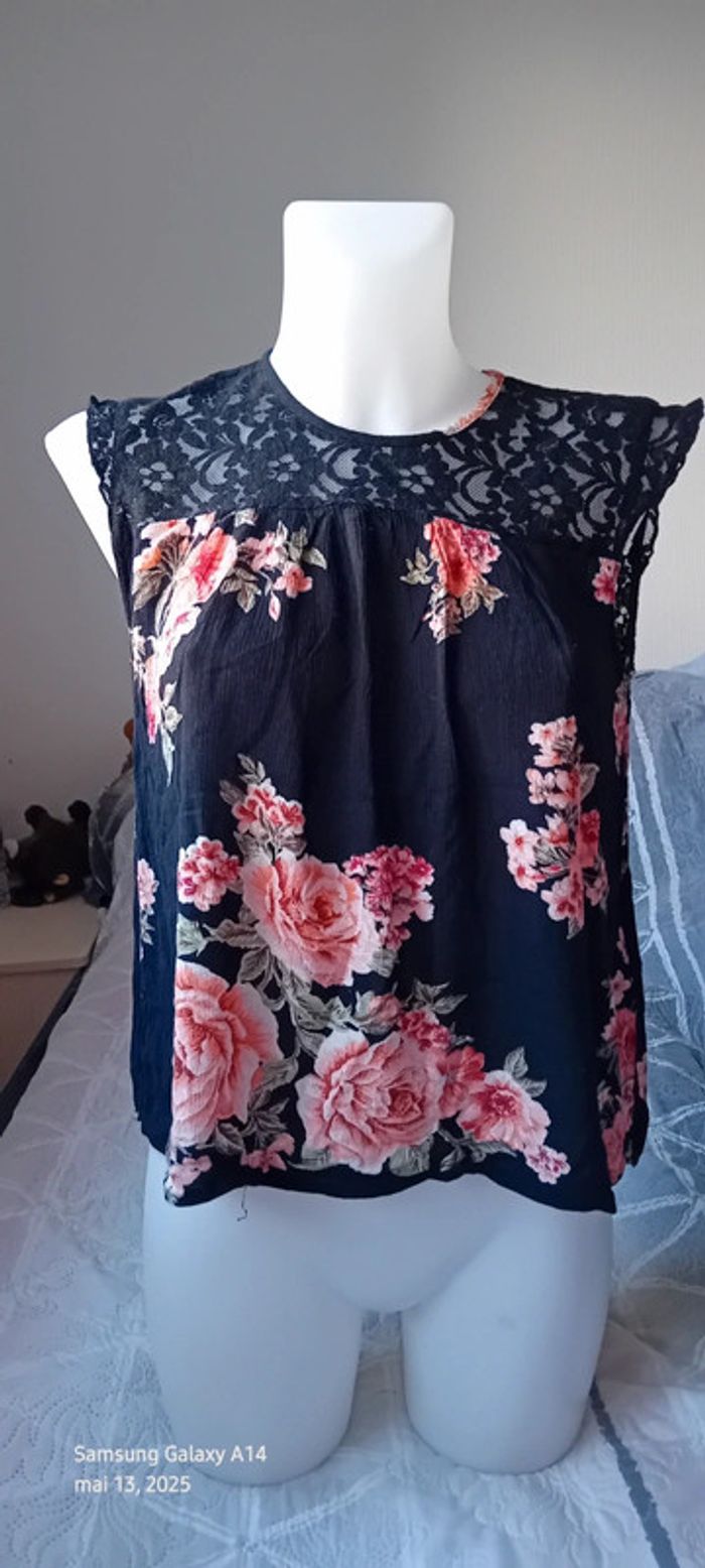 Haut sans manches en polyester viscose coton et nylon haut en dentelle ajourée motif floral bas motif fleurs roses effet froissé fermeture goutte d eau avec bouton au dos longueur 53 cm largeur aisselles à aisselles 46 cm largeur épaules 40 cm très peu porté en très bon état #midole #midolefemme #midolefemme38 #hautfemme38 #femme38 #debardeurfemme38 #debardeurmotifsfleurs38 #hautbimatiere38 #hautavecdentelle #only