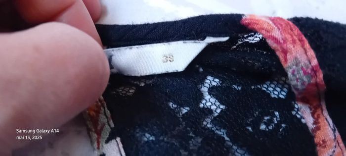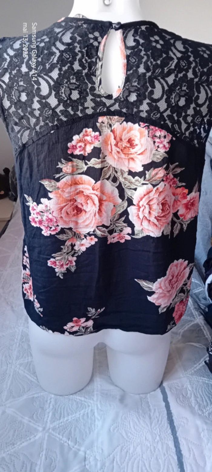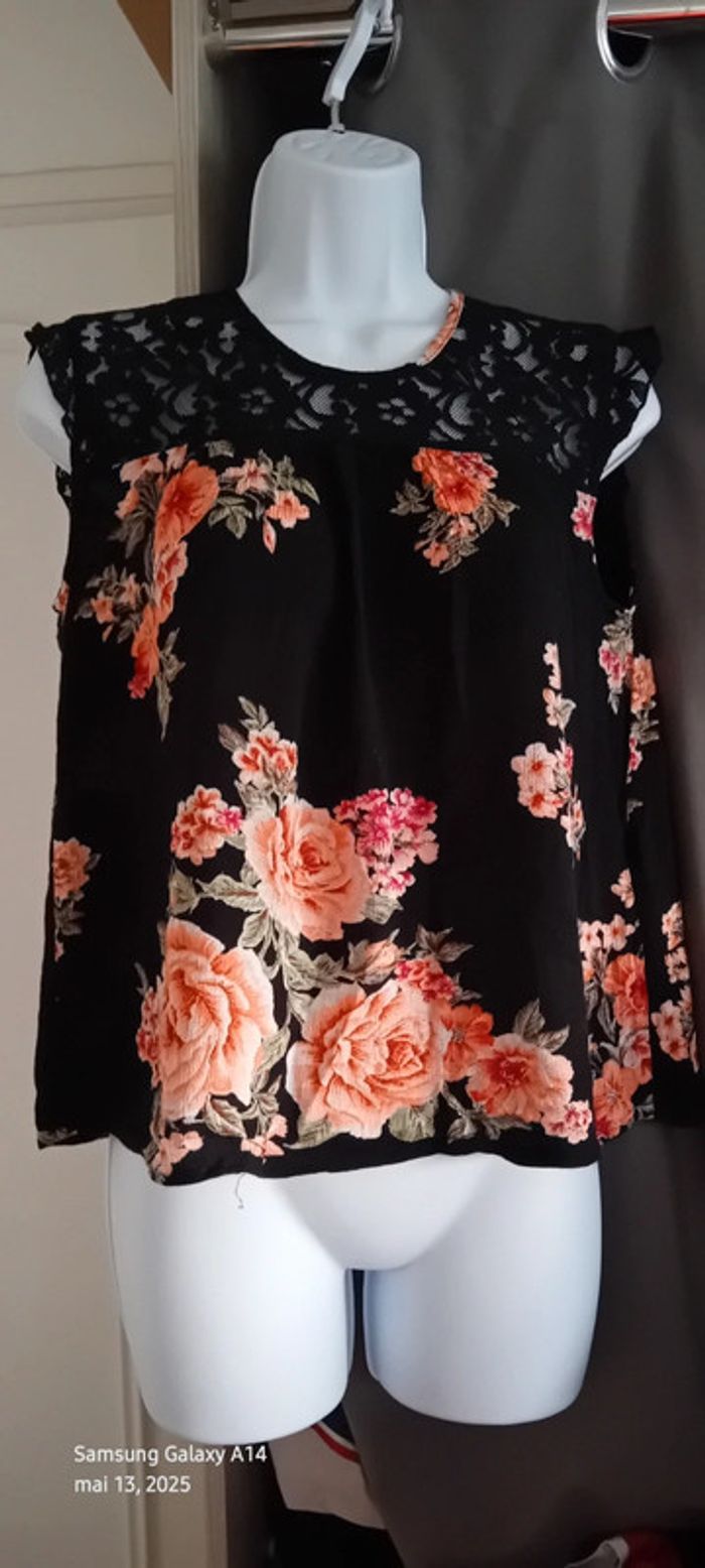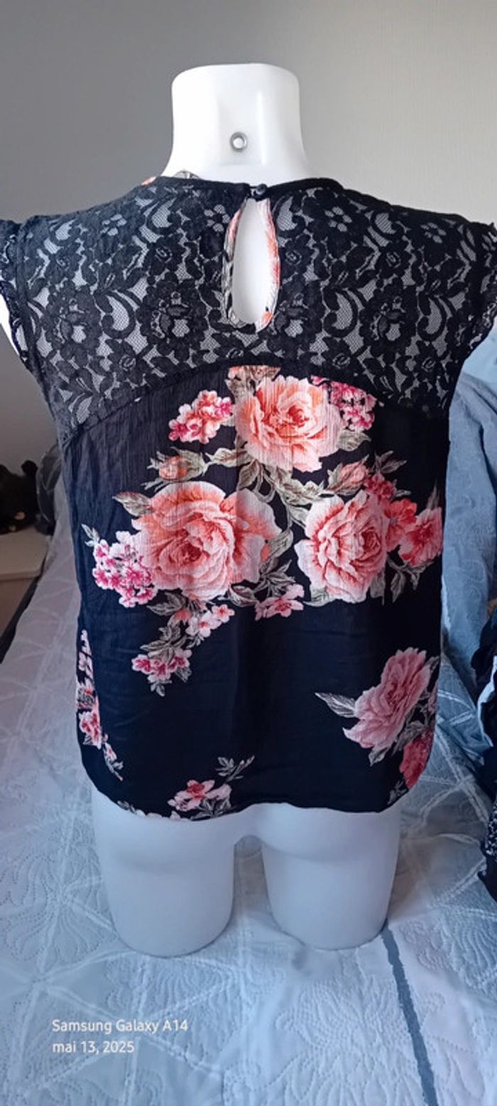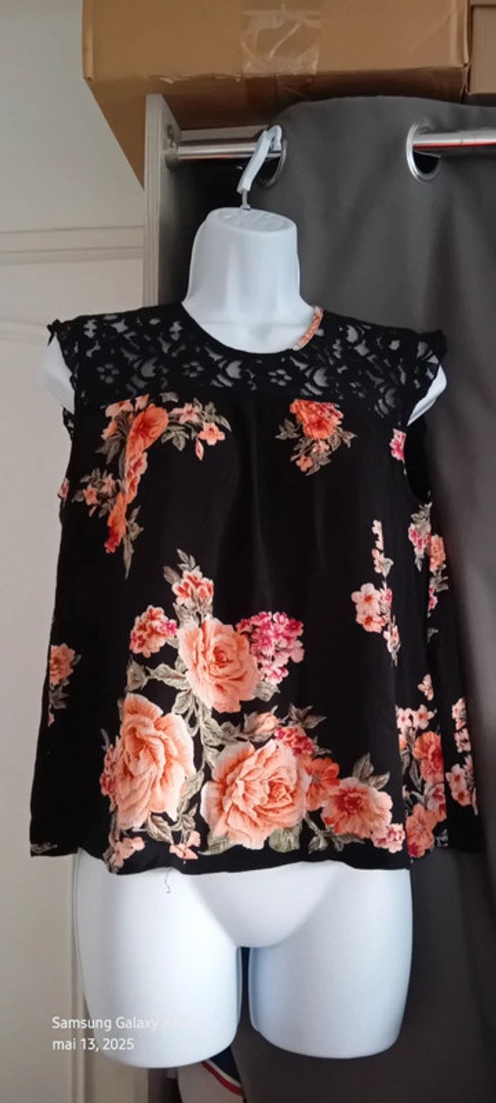 Haut sans manches en polyester viscose coton et nylon haut en dentelle ajourée motif floral bas motif fleurs roses effet froissé fermeture goutte d eau avec bouton au dos longueur 53 cm largeur aisselles à aisselles 46 cm largeur épaules 40 cm très peu porté en très bon état #midole #midolefemme #midolefemme38 #hautfemme38 #femme38 #debardeurfemme38 #debardeurmotifsfleurs38 #hautbimatiere38 #hautavecdentelle #only
