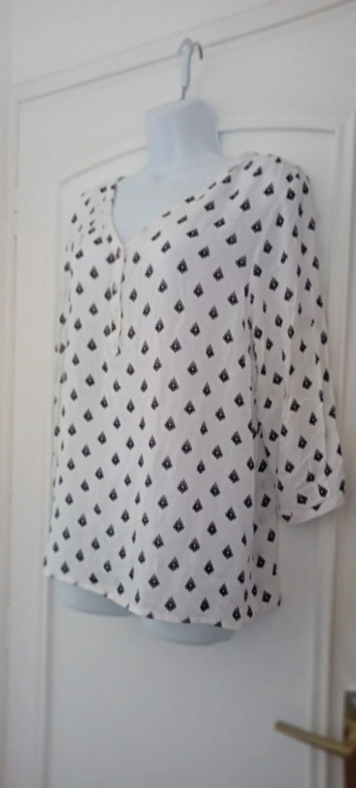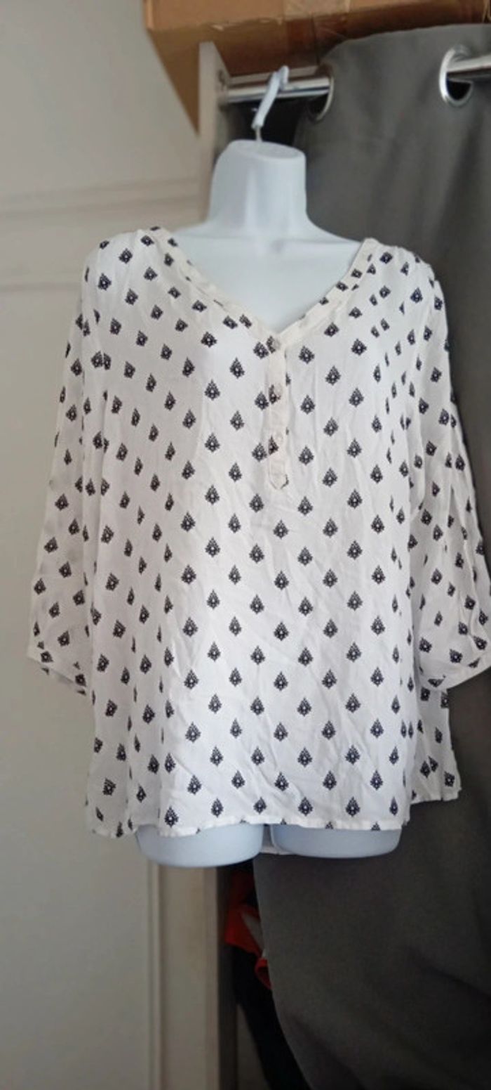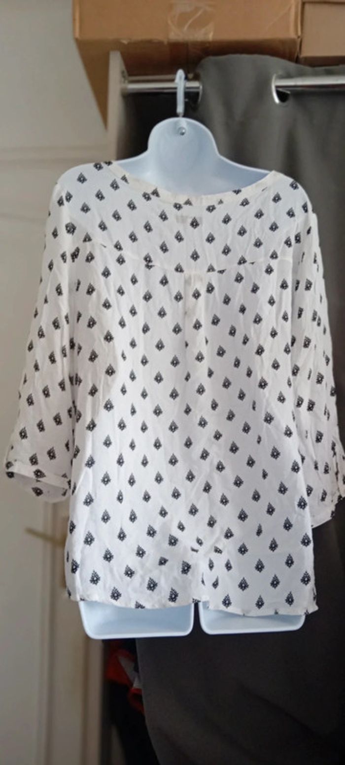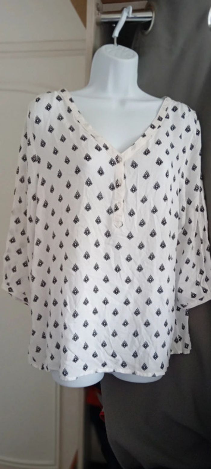 Blouse légère et fluide en polyester légèrement semitransparente manches 3/4 imprimé floral noir et blanc avec points en relief décolleté en V avec boutons longueur 54 cm largeur aisselles à aisselles 64 cm largeur épaules 44 cm correspond plus à un 44 car taille petit très peu portée en très bon état #midole #midolefemme #midolefemme44 #femme44 #femmexxl #blousefemme44 #blousefemmexxl #blousemanches3/4 #blouseimprimefloral #nafnaf #noiretblanc