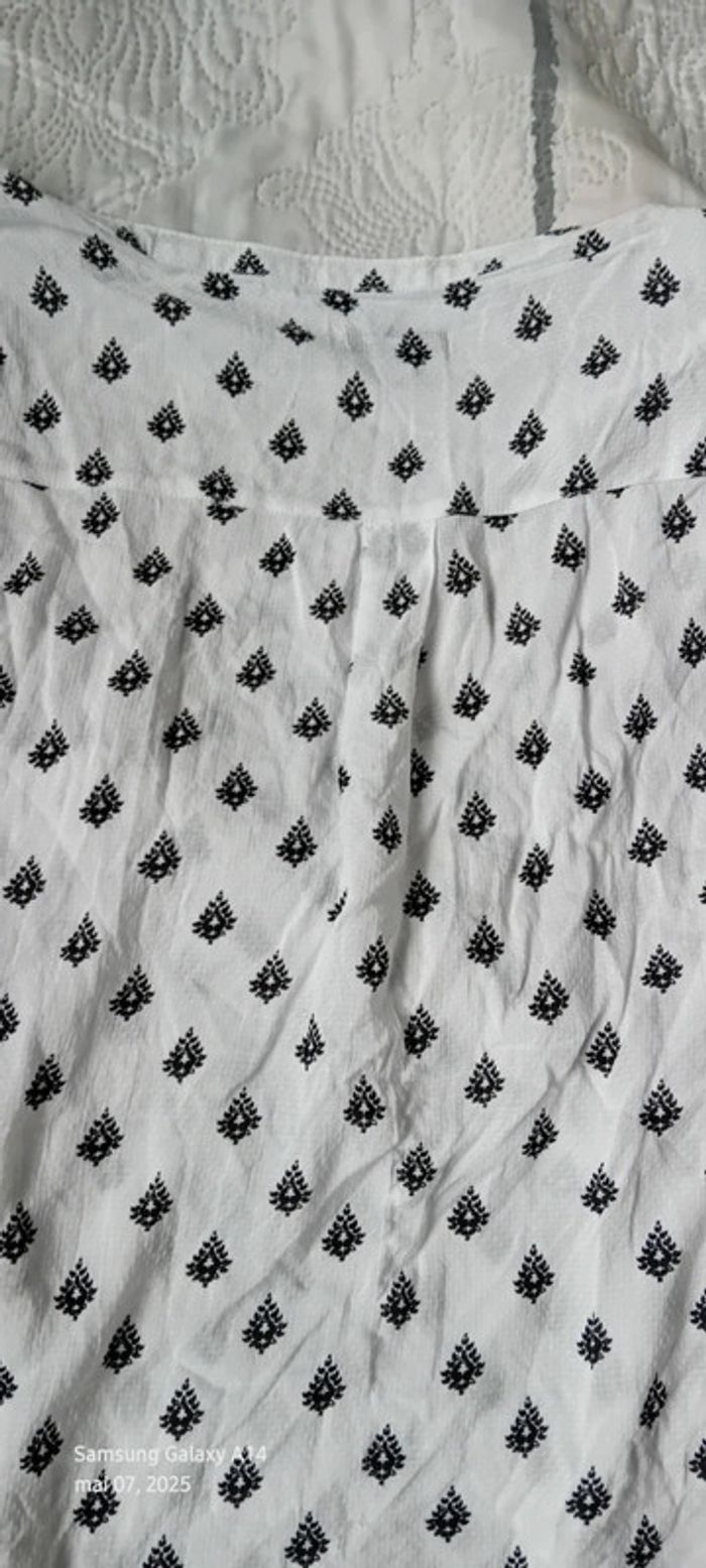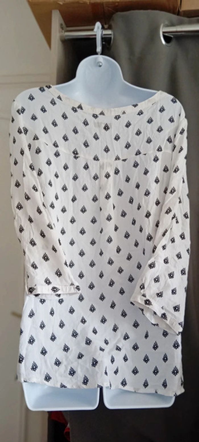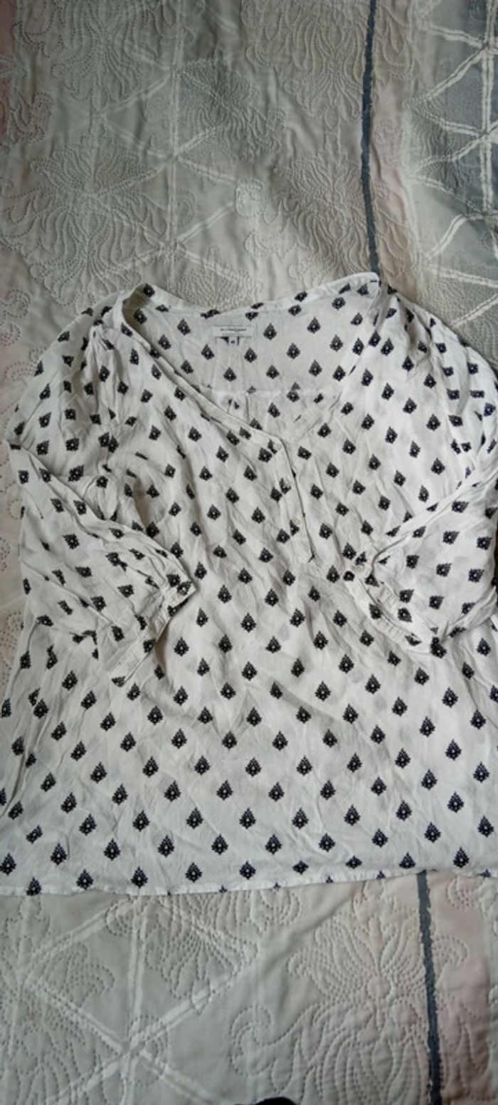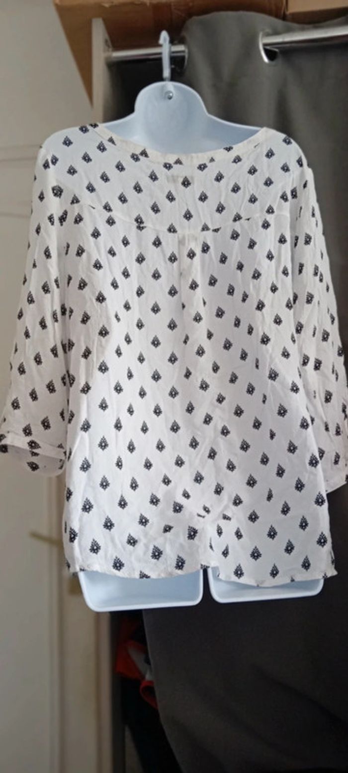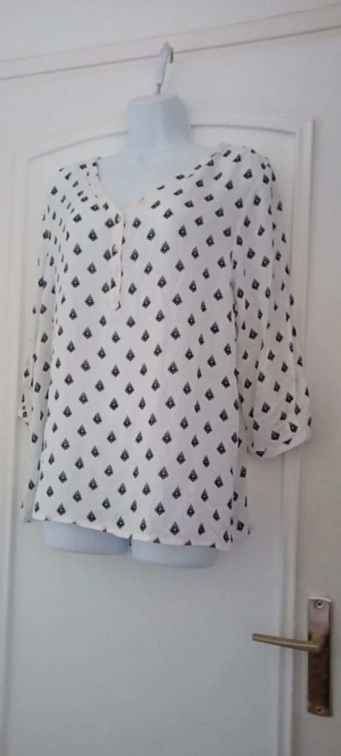 Blouse légère et fluide en polyester légèrement semitransparente manches 3/4 imprimé floral noir et blanc avec points en relief décolleté en V avec boutons longueur 54 cm largeur aisselles à aisselles 64 cm largeur épaules 44 cm correspond plus à un 44 car taille petit très peu portée en très bon état #midole #midolefemme #midolefemme44 #femme44 #femmexxl #blousefemme44 #blousefemmexxl #blousemanches3/4 #blouseimprimefloral #nafnaf #noiretblanc