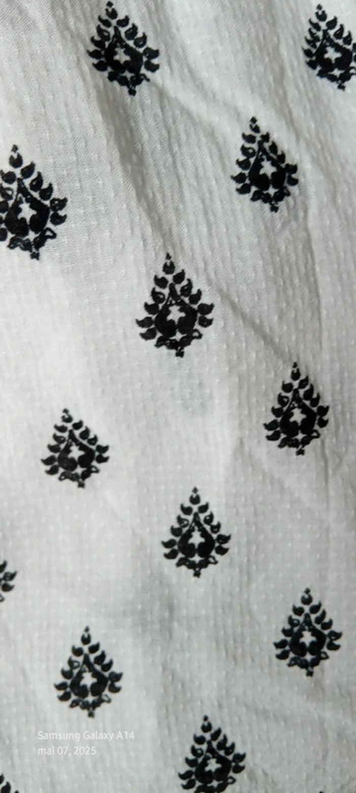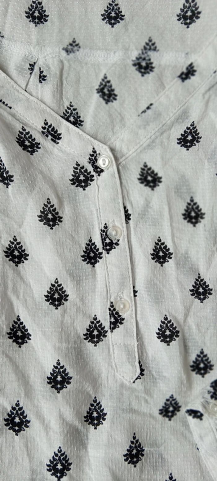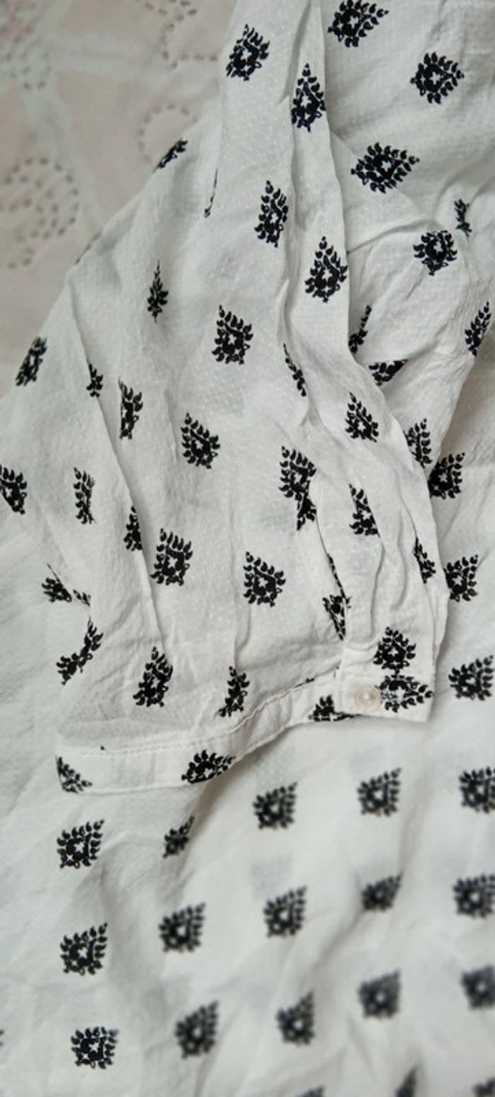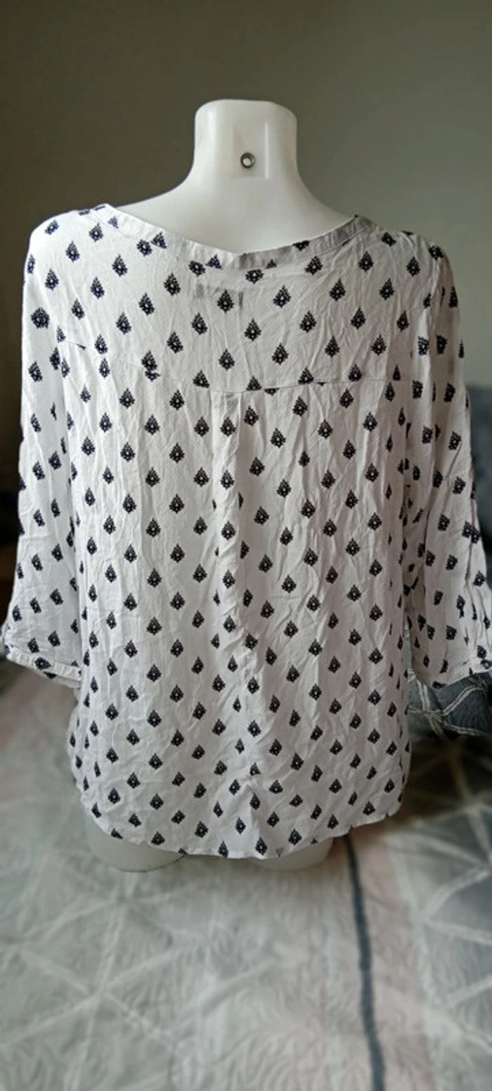 Blouse légère et fluide en polyester légèrement semitransparente manches 3/4 imprimé floral noir et blanc avec points en relief décolleté en V avec boutons longueur 54 cm largeur aisselles à aisselles 64 cm largeur épaules 44 cm correspond plus à un 44 car taille petit très peu portée en très bon état #midole #midolefemme #midolefemme44 #femme44 #femmexxl #blousefemme44 #blousefemmexxl #blousemanches3/4 #blouseimprimefloral #nafnaf #noiretblanc