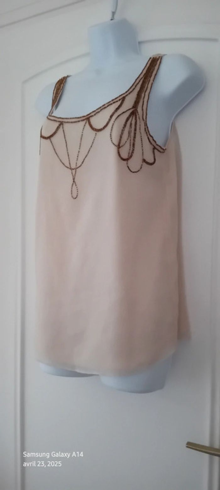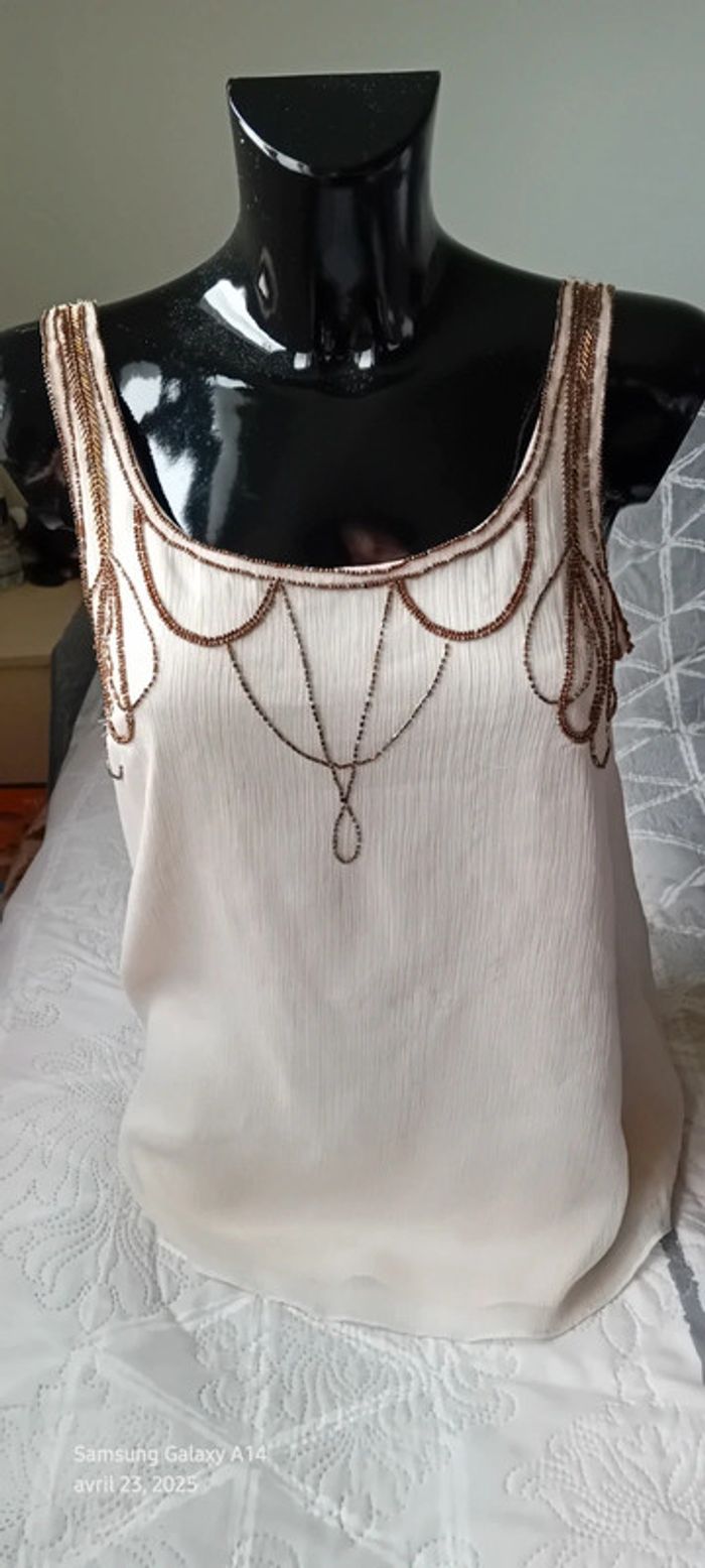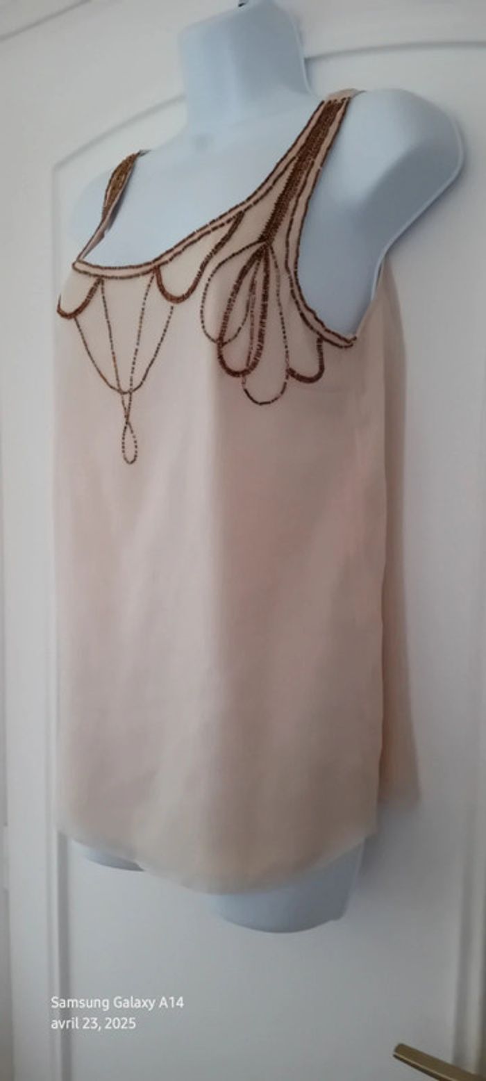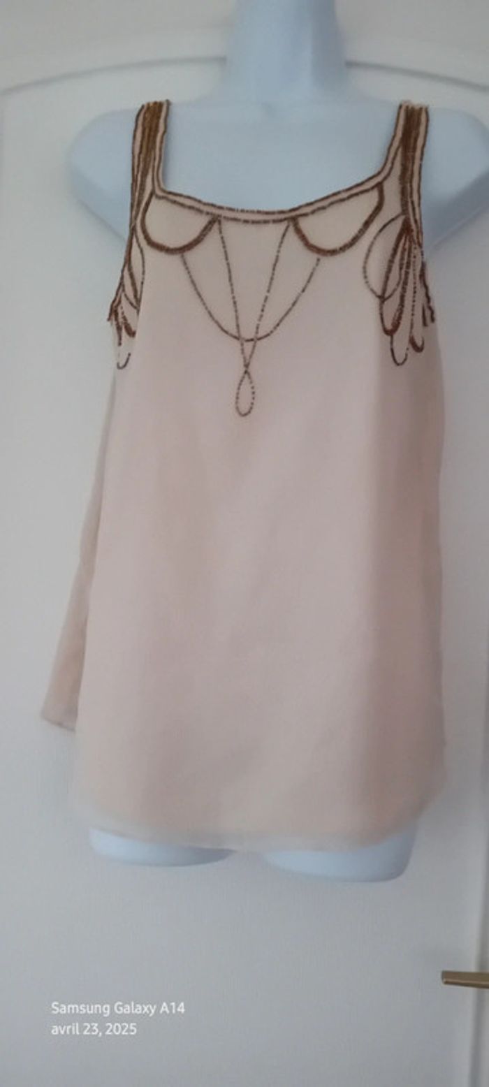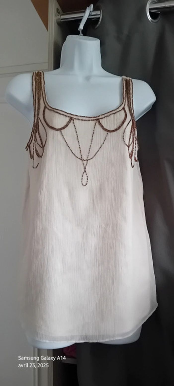 Haut en polyester et viscose doublure polyamide effet plissé aspect voile doublé sequins dorés au décolleté et bretelles ideal pour une cérémonie ou grande occasion Longueur 64 cm largeur aisselles à aisselles 43 cm peu porté en bon état ⚠️ quelques petits fils tirés devant (voir dernières photos) #midole #midolefemme #midolefemme38 #hautfemme38 #femme38 #debardeurfemme38 #tuniquefemme38 #hautceremoniefemme38 #hautphildar38 #beige hautavecsequins