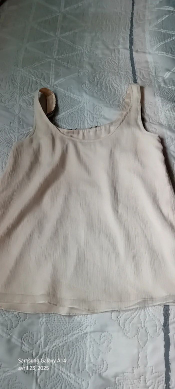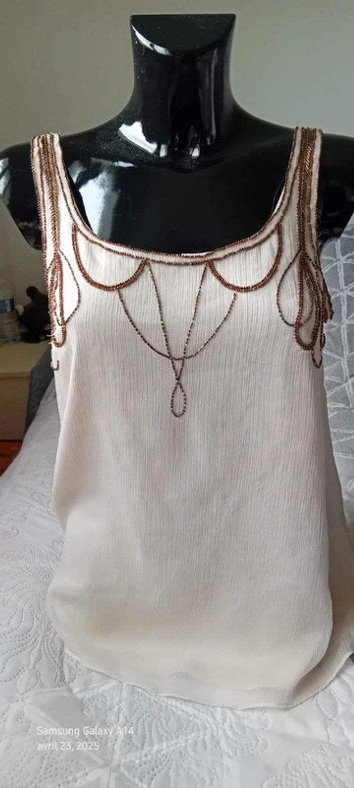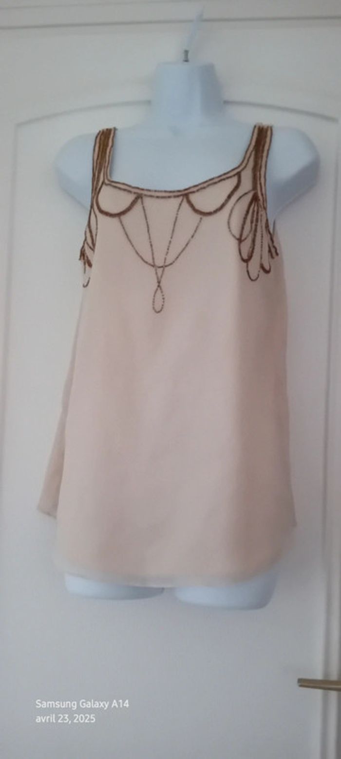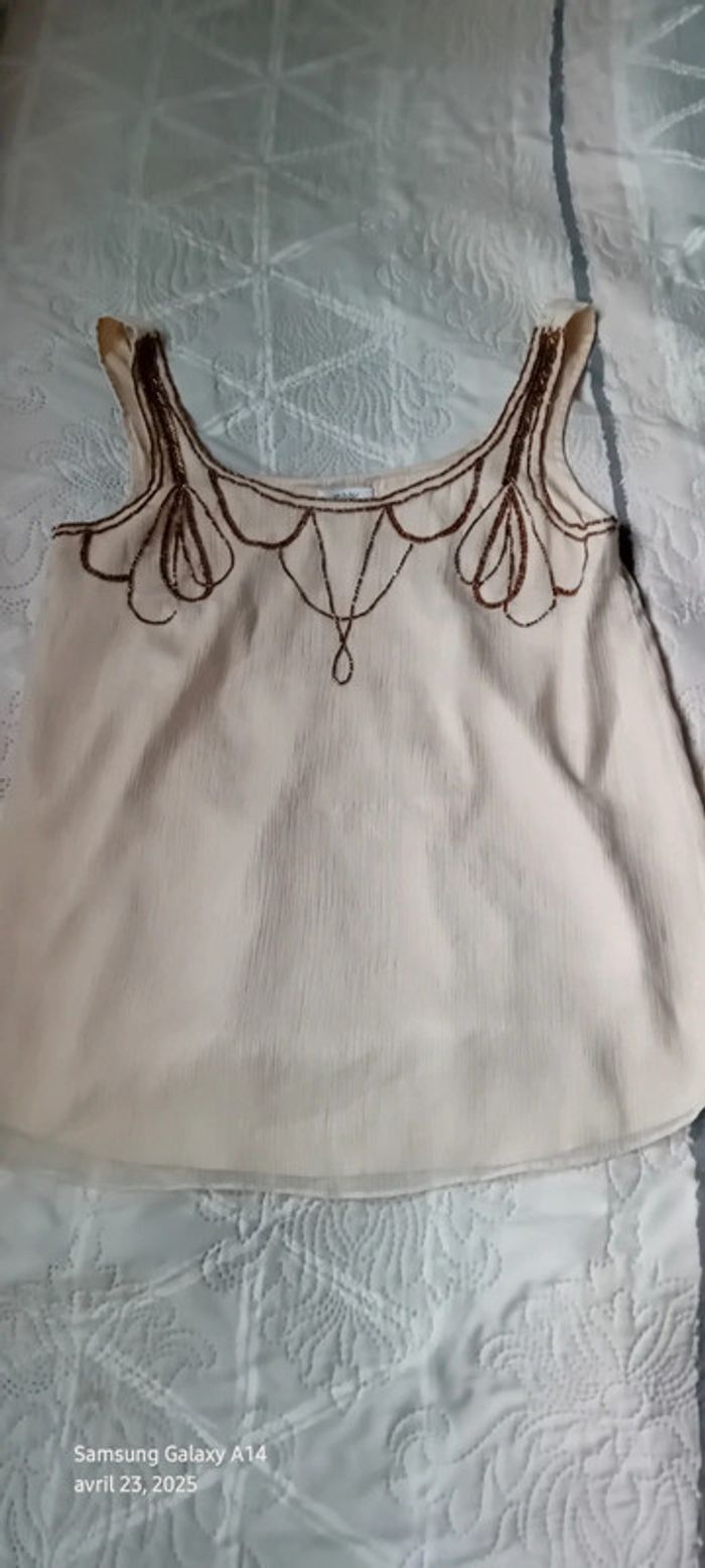 Haut en polyester et viscose doublure polyamide effet plissé aspect voile doublé sequins dorés au décolleté et bretelles ideal pour une cérémonie ou grande occasion Longueur 64 cm largeur aisselles à aisselles 43 cm peu porté en bon état ⚠️ quelques petits fils tirés devant (voir dernières photos) #midole #midolefemme #midolefemme38 #hautfemme38 #femme38 #debardeurfemme38 #tuniquefemme38 #hautceremoniefemme38 #hautphildar38 #beige hautavecsequins