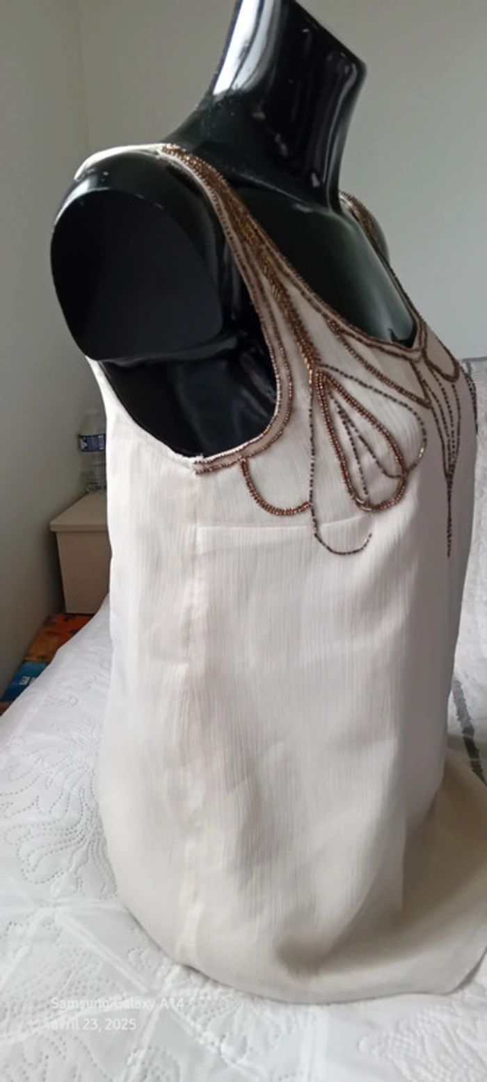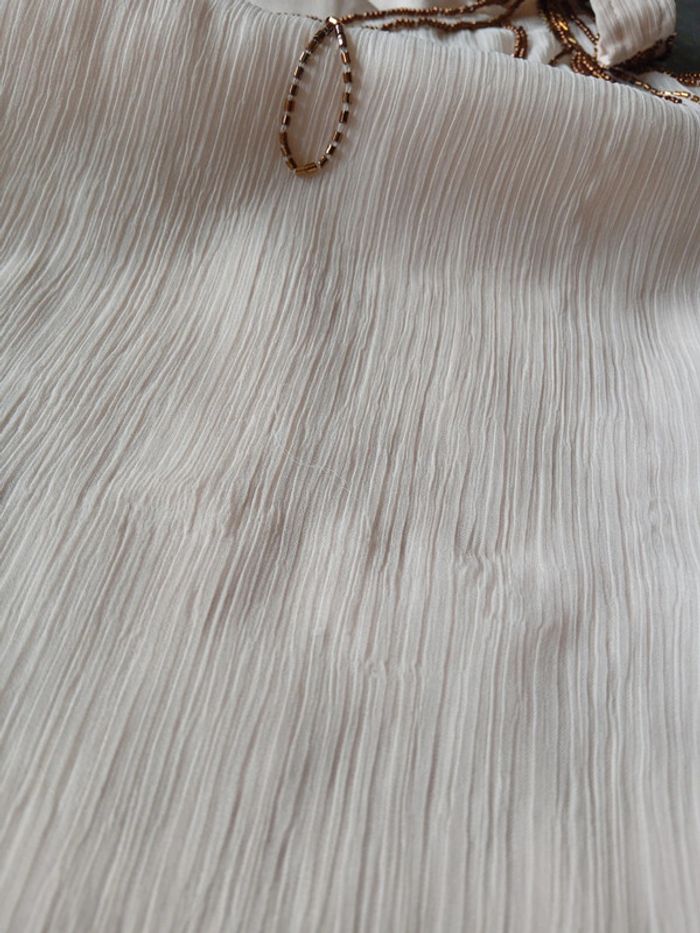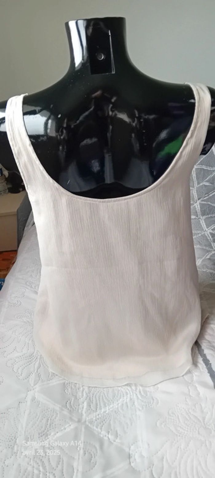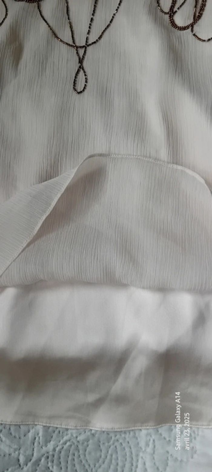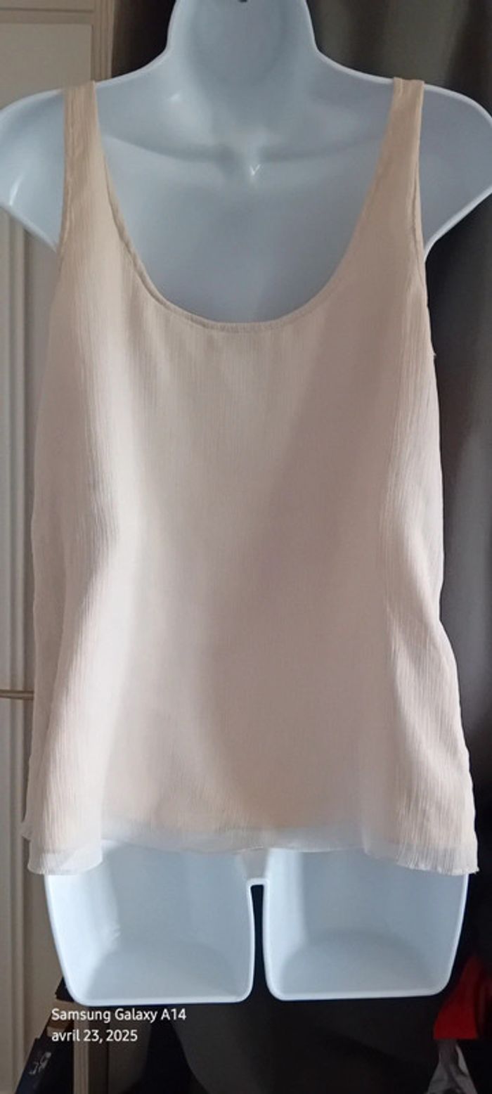Haut en polyester et viscose doublure polyamide effet plissé aspect voile doublé sequins dorés au décolleté et bretelles ideal pour une cérémonie ou grande occasion Longueur 64 cm largeur aisselles à aisselles 43 cm peu porté en bon état ⚠️ quelques petits fils tirés devant (voir dernières photos) #midole #midolefemme #midolefemme38 #hautfemme38 #femme38 #debardeurfemme38 #tuniquefemme38 #hautceremoniefemme38 #hautphildar38 #beige hautavecsequins
