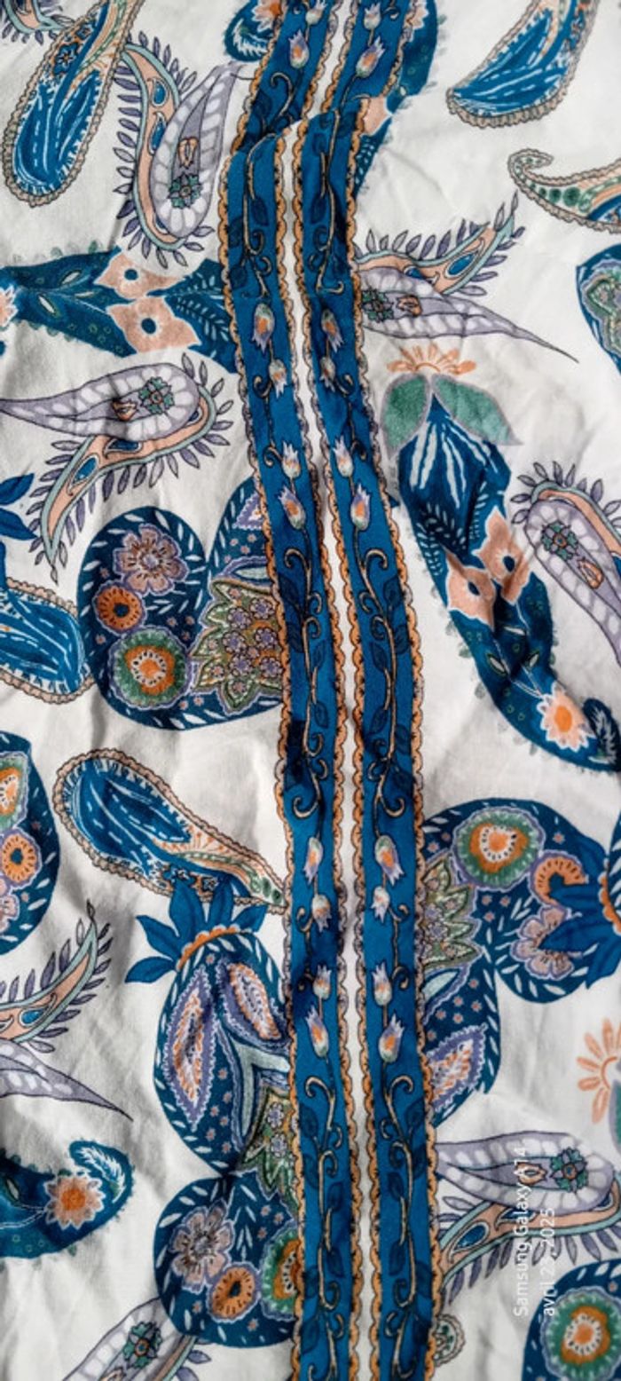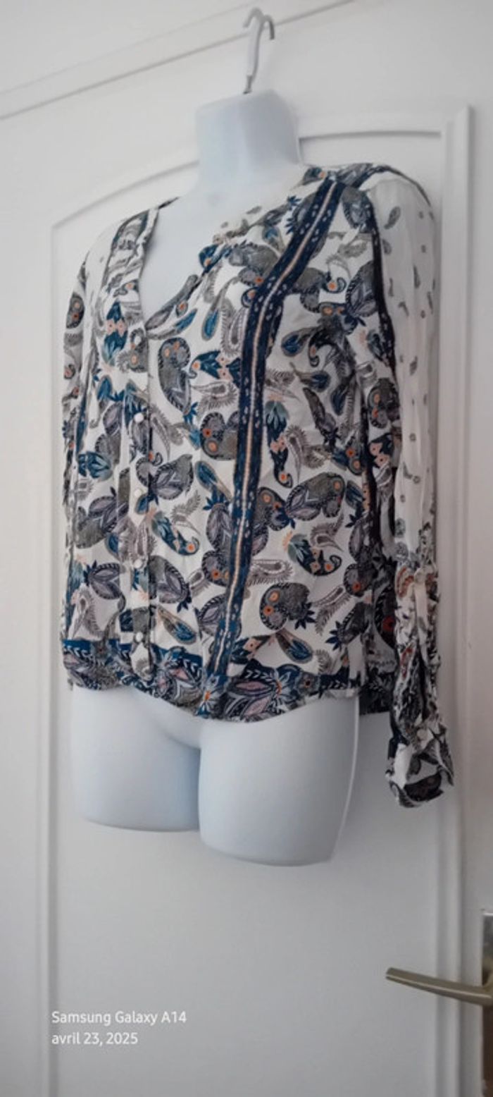 Blouse en viscose matière légère et fluide manches longues réglables col en V boutons nacrés motif floral et arabesques plus courte devant que derrière longueur 53 cm devant et 60 cm derrière largeur aisselles à aisselles 48 cm largeur épaules 42 cm longueur manches de 40 à 56 cm très peu portée en très bon état #midole #midolefemme #midolefemme38 #hautfemme38 #femme38 #blousefemme38 #blouseenviscose #blousemanchesajustables #blousebreal #breal38