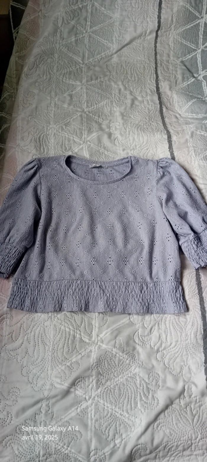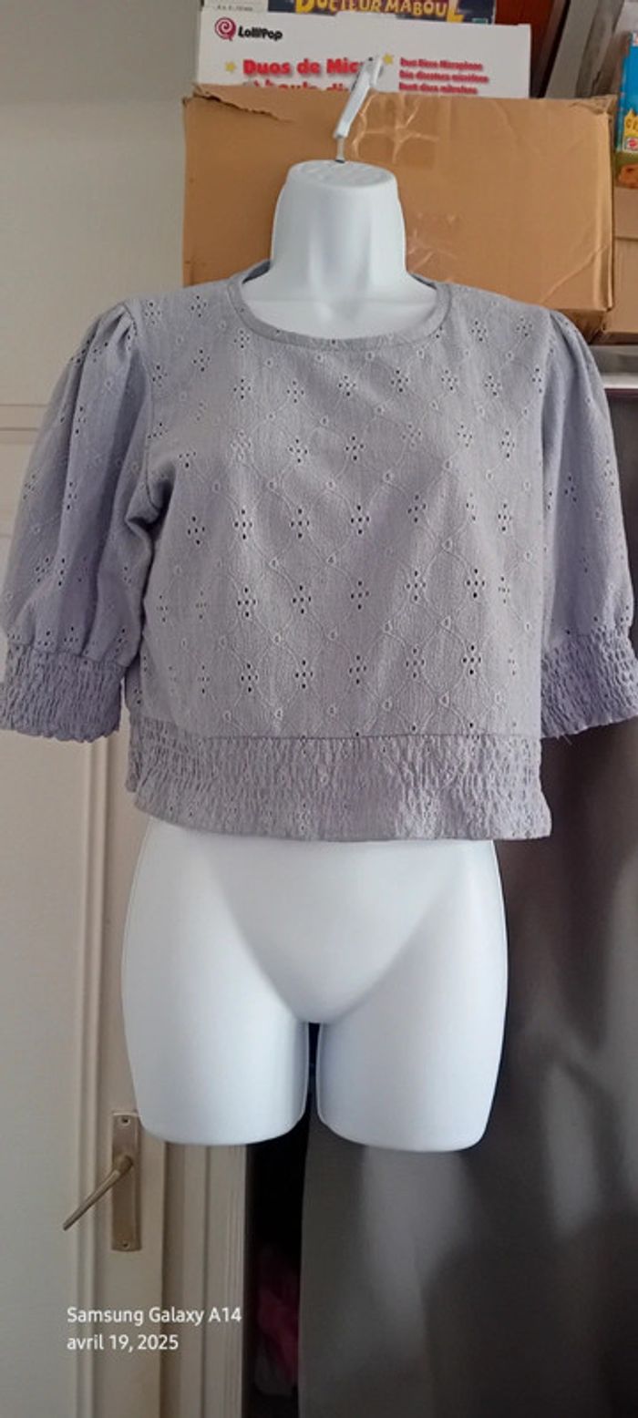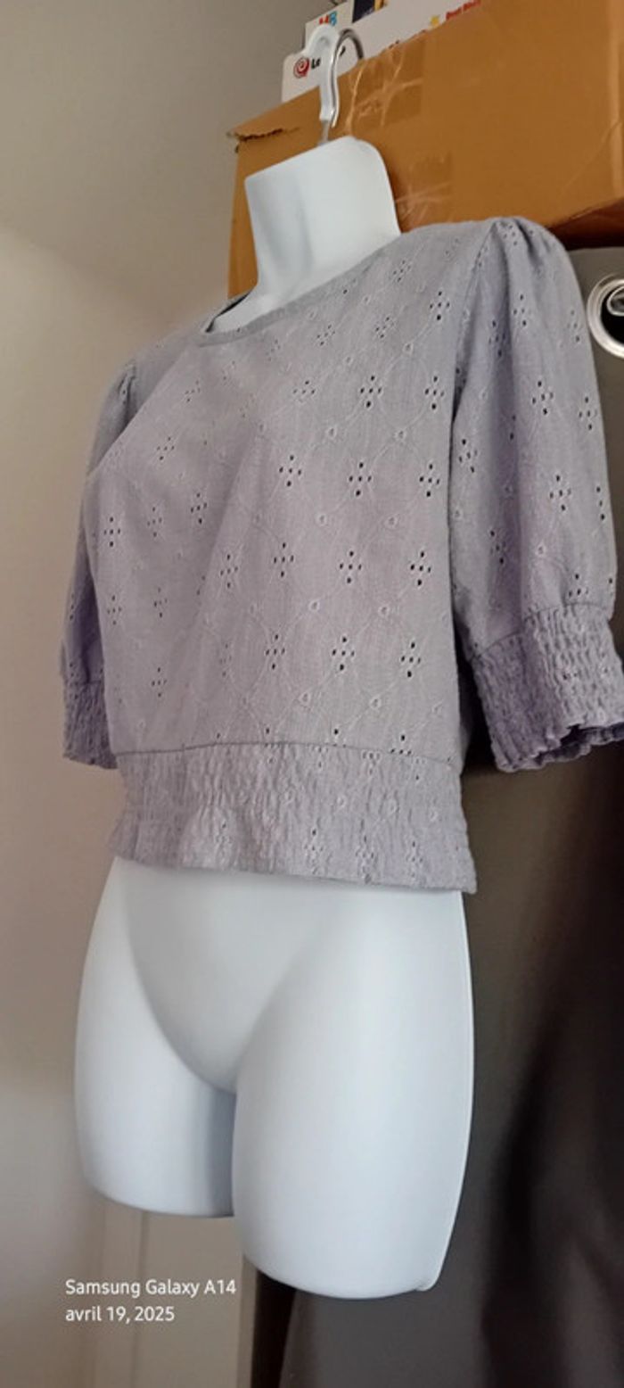 Haut court en polyester et elastanne matière fluide effet dentelle ajourée motif floral manches 3/4 élastique smock aux manches et en bas couleur lavande longueur 46 cm largeur aisselles à aisselles 50 cm largeur épaules 36 cm longueur manches 33 cm marque pull & bear juste porté une ou deux fois en très bon état comme neuf #midole #midolefemme #midolefemme38 #femme38 #pullandbear #hautcourtpullandbear #hautmailleajouree #lavande #élastiquesmock