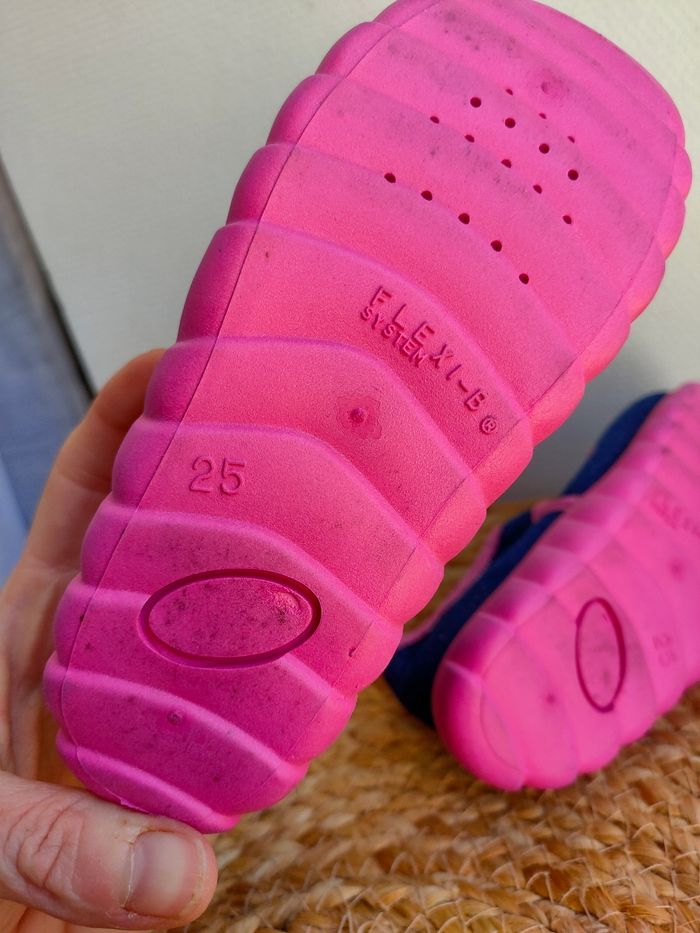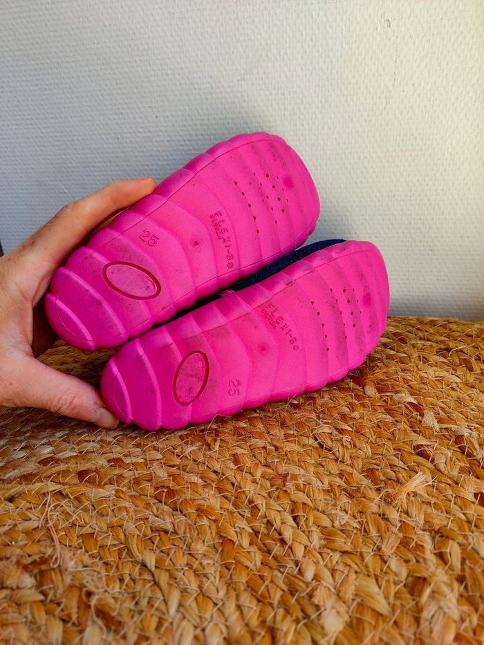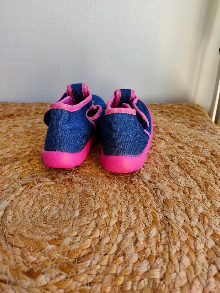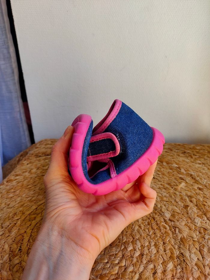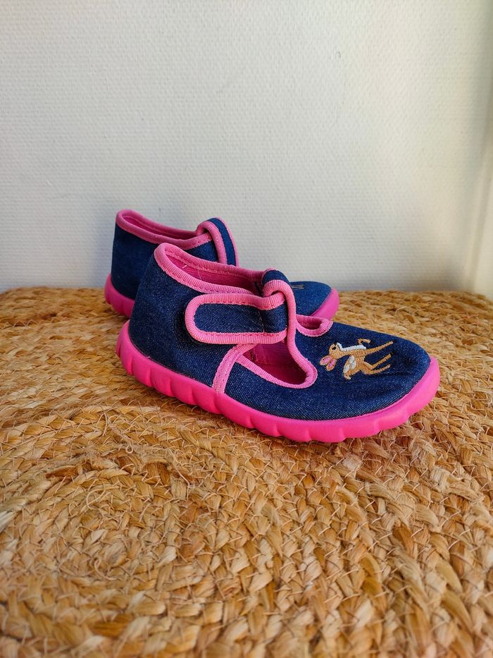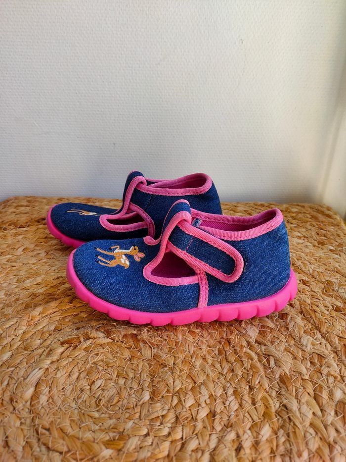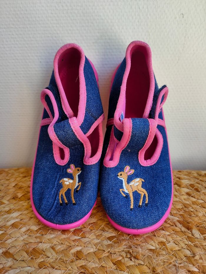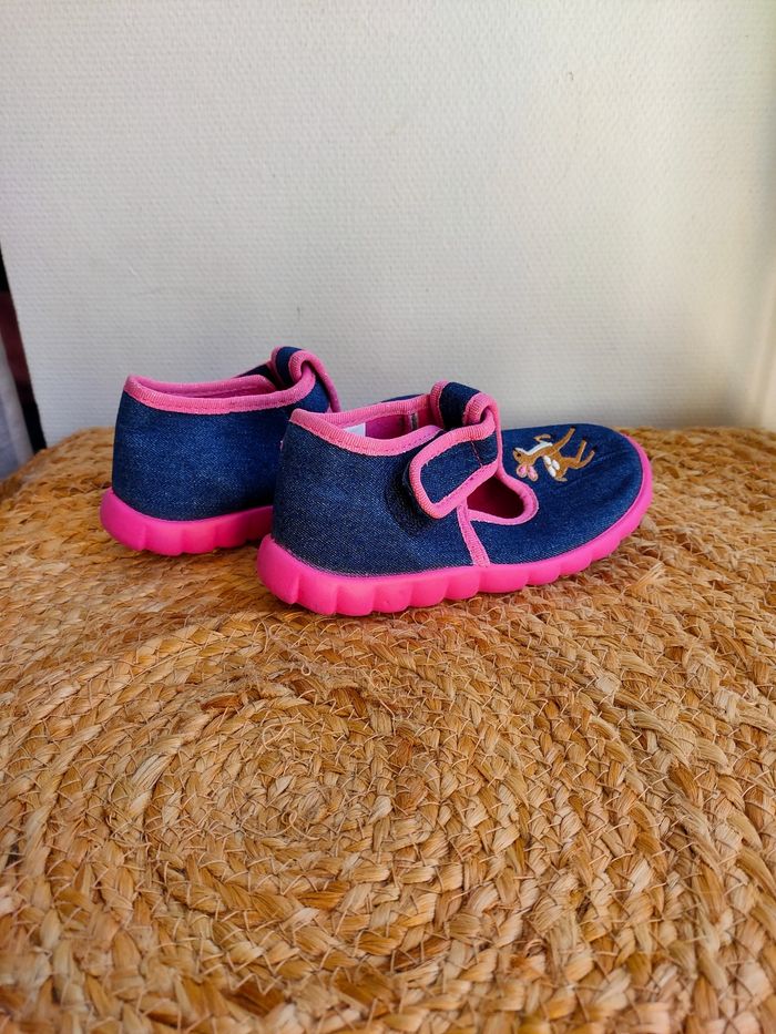 Chaussons souples tissu effet jeans et couleur fuchsia, motifs biches. Taille 25. Elles sont en excellent état, proche du neuf, porté 5 minutes à peine. Prix ferme, PAS DE NÉGO !!!