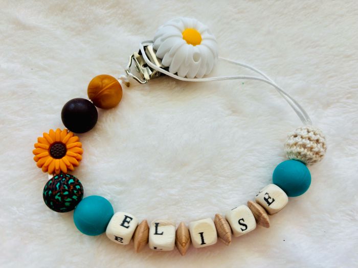 Attache tétine fleur – Modèle TURQUOISE Craquez pour cette jolie attache tétine en silicone et bois, alliant douceur, sécurité et élégance. Son design fleuri dans des tons crème en fait un accessoire chic et intemporel, parfait pour accompagner bébé au quotidien. Personnalisable avec le prénom de votre enfant, c’est un cadeau idéal pour une naissance ou une baby shower. Chaque pièce est unique et faite avec soin. Découvrez également d’autres modèles disponibles sur mon profil !