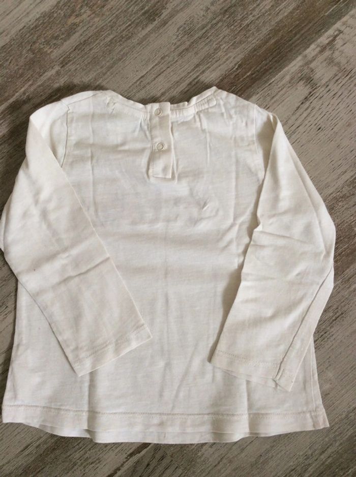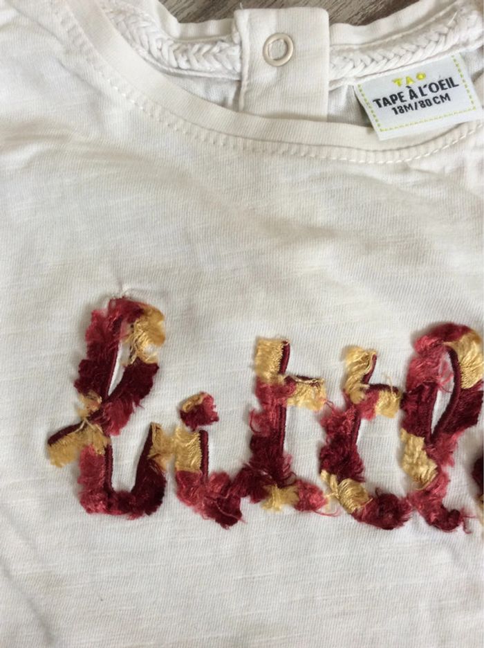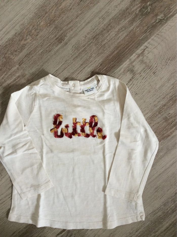 t-shirt manches longues Tape à l’œil 18 mois très bon état général mis à part un petit point de couture au dessus de la première lettre