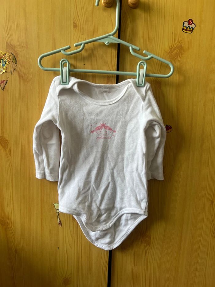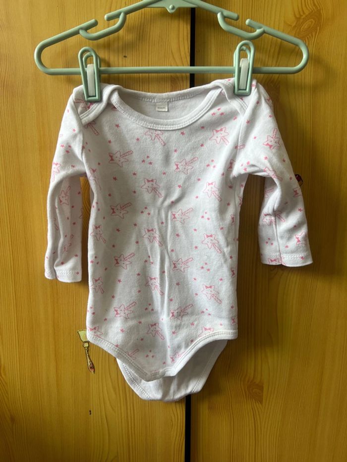 Lot de 3 bodys manches longues, un rose, un blanc avec des baguettes magiques et un blanc avec une tête de princesse, en 12 mois. ⚠️Possibilité de prendre 2 bodys pour 1€.⚠️ #Misterlica_12mois