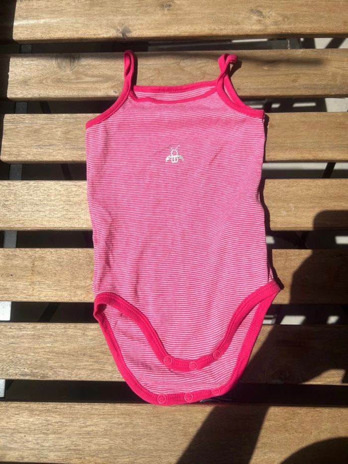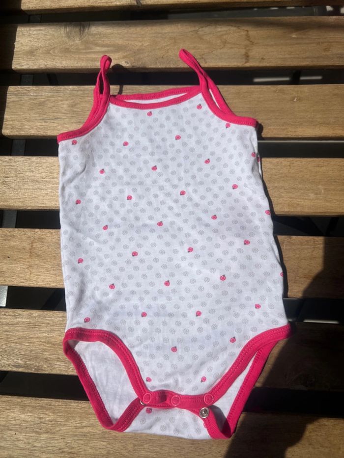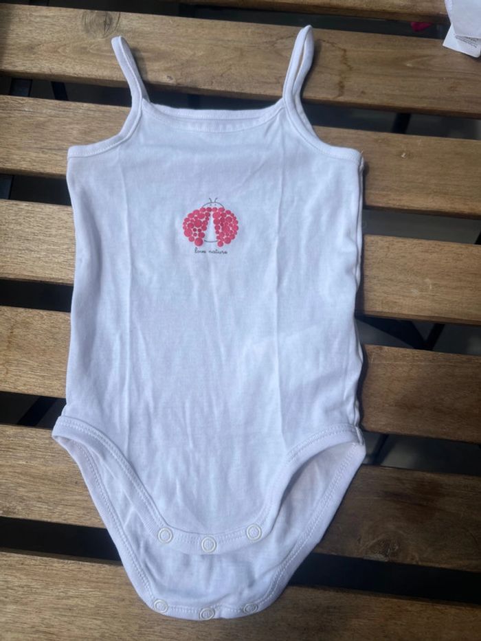 Lot de trois body Obaïbi à bretelles, en 18 mois. L’un et blanc avec une coccinelle dessus. Un autre est blanc avec des coccinelles et d’autres dessins dessus. Le dernier est rayé rose et blanc. ⚠️Possibilité de prendre 2 bodys pour 1€.⚠️ #Misterlica_18mois
