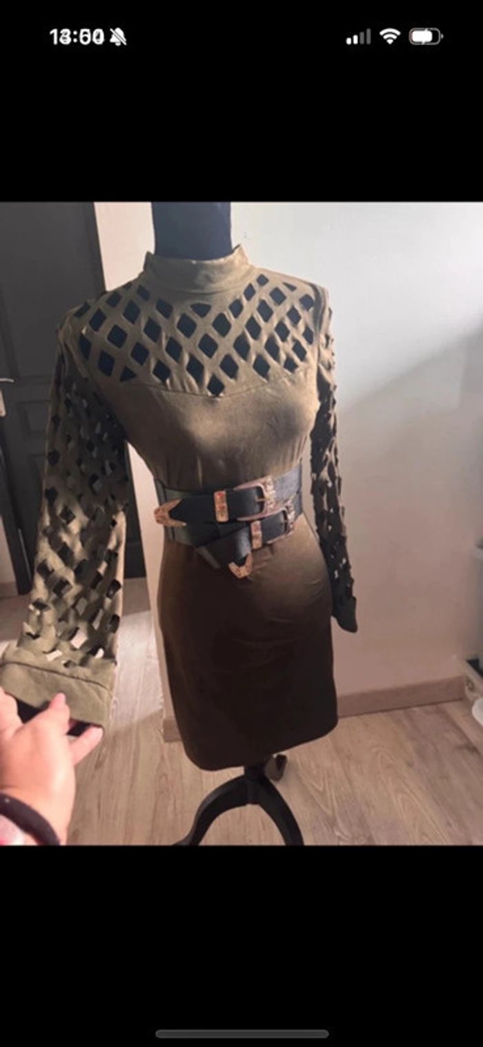 magnifique Robe mini kaki matière très agréable légère style camouflage ajourée sur manches et décolleté fermeture ds le dos parfait état Vendue sans ceinture taille 36 #lalab0129_tailleS #lalab0129_taille36