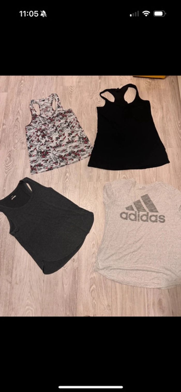 Lot 4 pièces 3 débardeurs (voir photo petit Accro sur le débardeur noir) 1 t-shirt adidas Taille S #lalab0129_tailleS #lalab0129_taille36